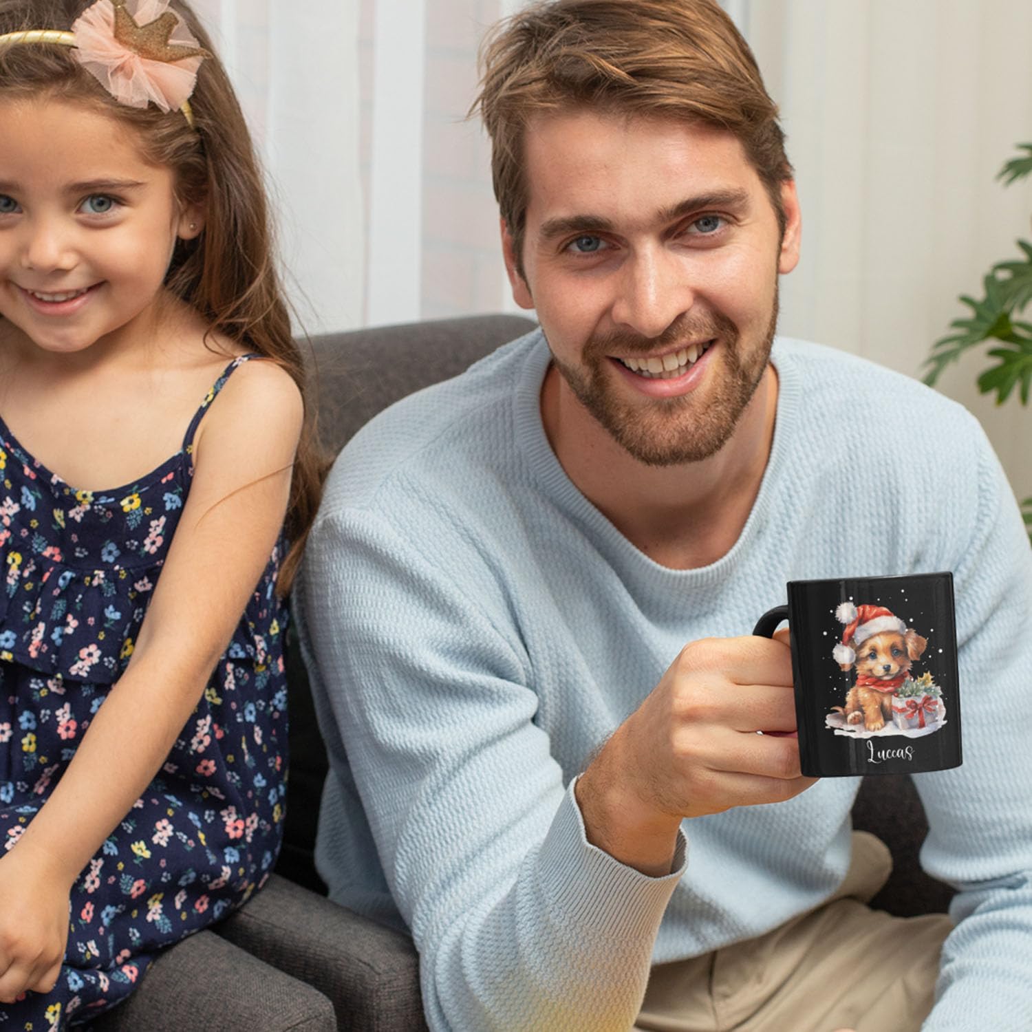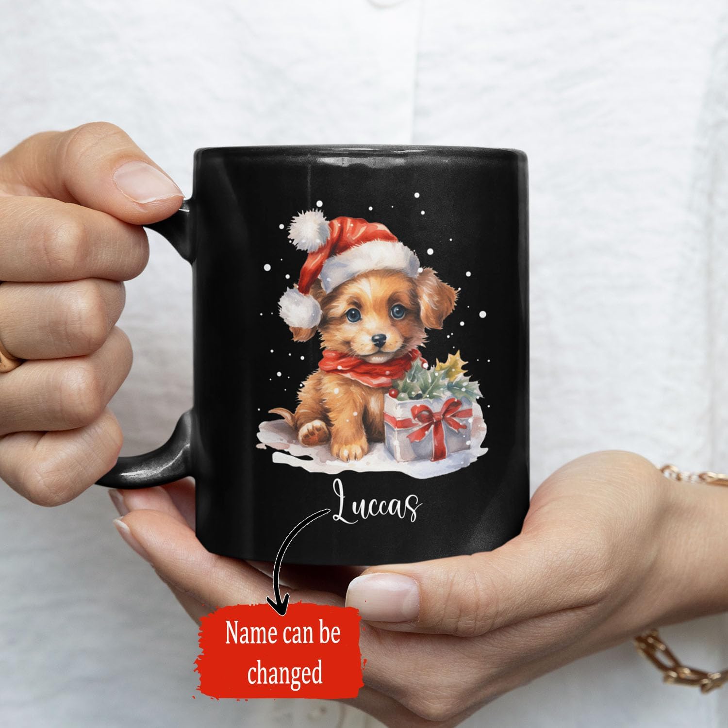 Personalized Name Christmas Puppy Cup - Novelty Coffee Mug 11oz 15oz, Customized Santa Hat Design, Custom Pet Owner Black Ceramic Cup, Gift for Christmas, Puppy Lover