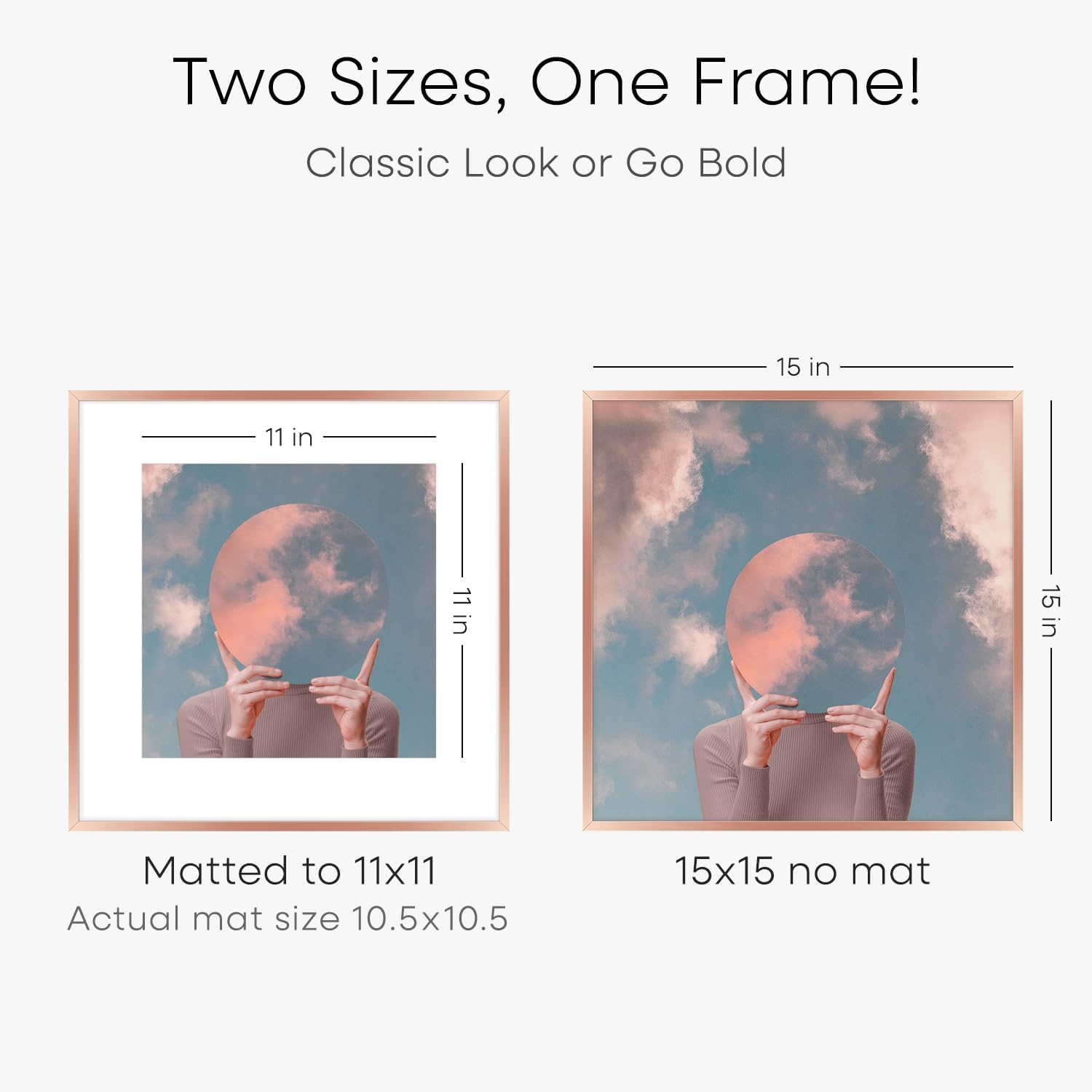 - MATTED OR EDGE-TO-EDGE—YOUR CALL. A crisp 11x11 white mat creates negative space, elevating your image with gallery precision. Or remove it for 15x15 bold, uninterrupted impact.