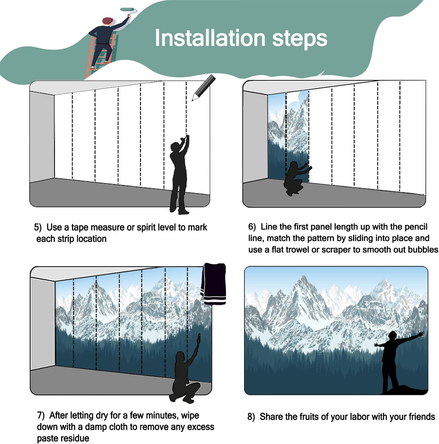 - Mural wallpaper size: 180 "W x 115 "H, divided into 9 sections, each section is labeled with a number underneath, there is no need to overlap the pattern when installing, just install according to the number labeled underneath the panel