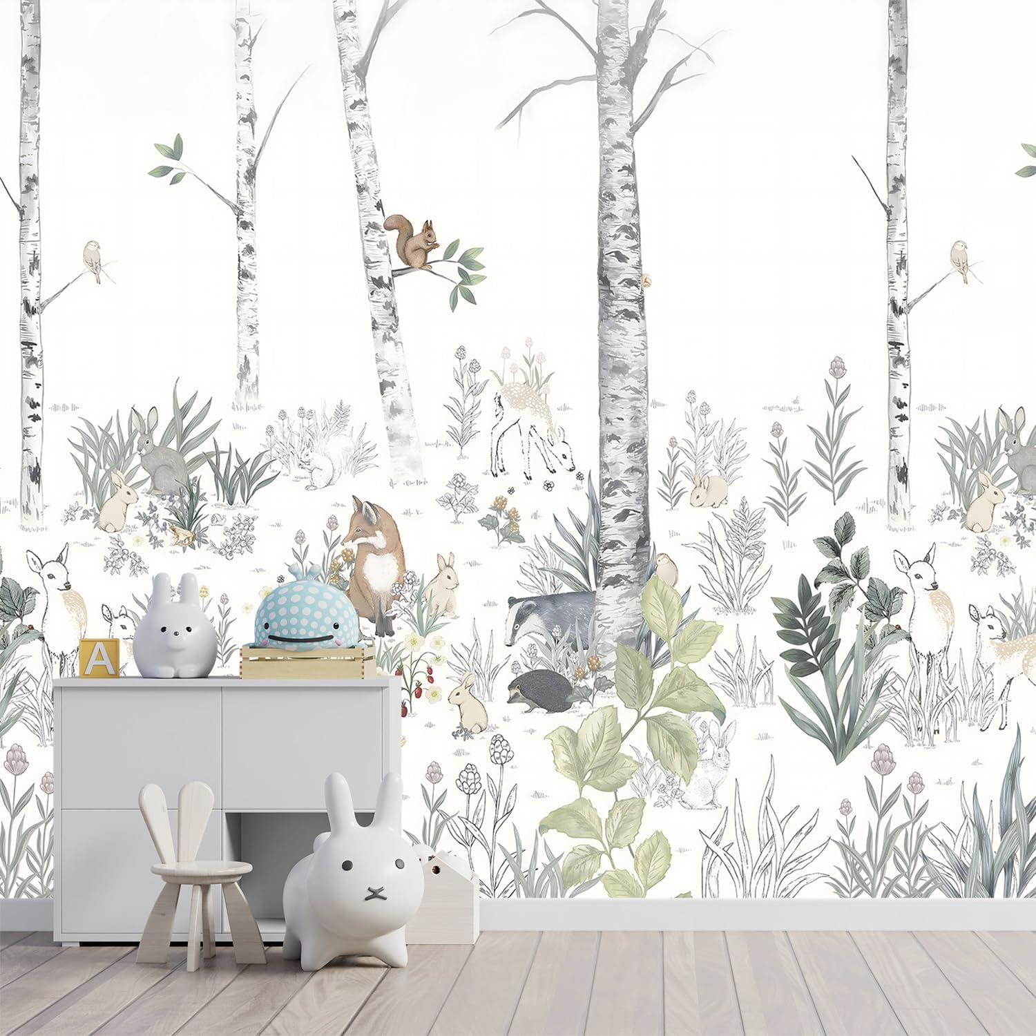 -Nursery Cartoon Woods Hand-Painted Animal Wallpaper Children's Room XT10 S 100" x 65"