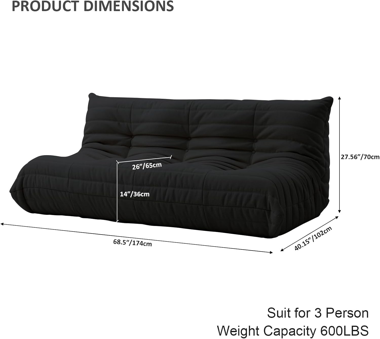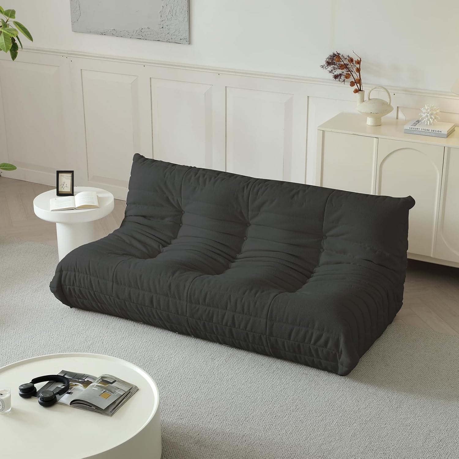 Luxury Sofa Couch Chair, Lazy Floor Seating, Fireside Bean Bag Chair, Ergonomic Tatami Sofa Lounger for Living Room, Bedroom, Office, 3 Seat, Black