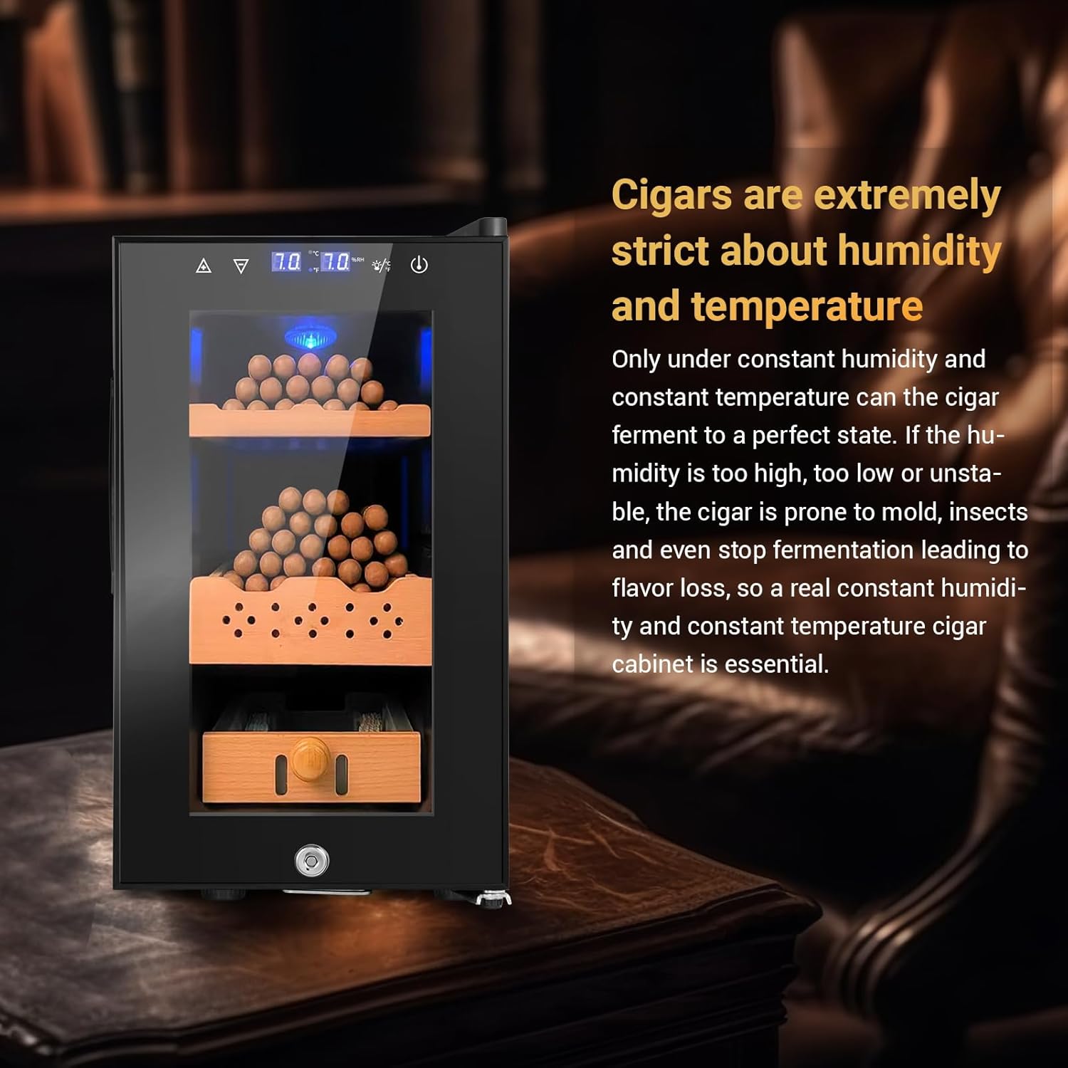 - Precision at Your Fingertips: Take charge with touch-controlled temperature and humidity settings, maintaining interior climates between 15-22°C (59-72°F) and humidity levels ranging from 60% to 75%, ensuring your cigars age gracefully