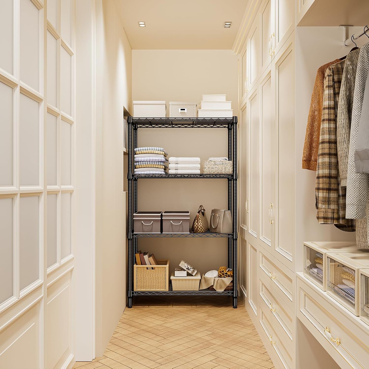 - VERSATILE DESIGN: The shelving units offer incredible versatility. It is suitable for use in a garage, balcony, pantry, and kitchen. Its special coating ensures water resistance, making it accommodated for humid environments like bathrooms