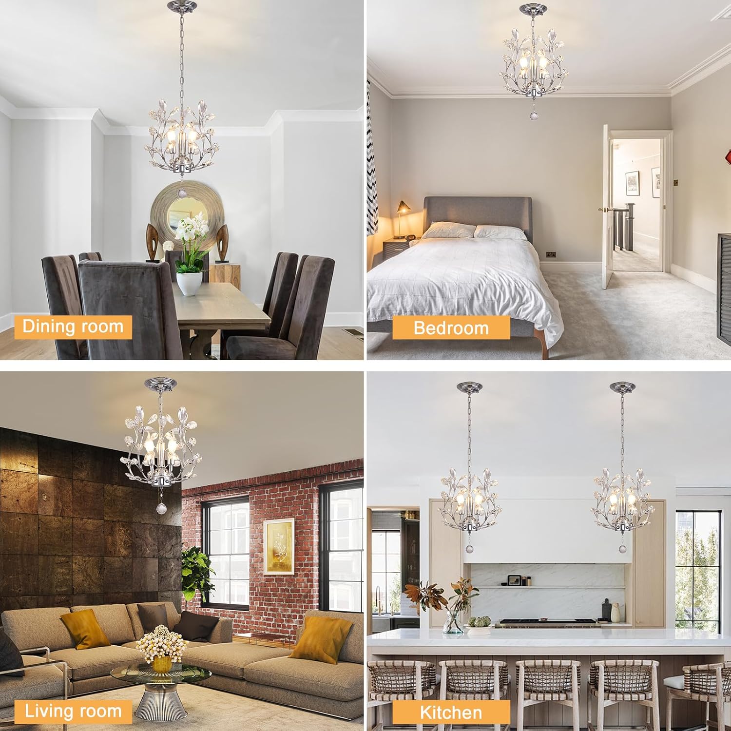 Ganeed 3-Light Branch Crystal Chandelier, Small Flush Mount Vintage Pendant Hanging Lighting, K9 Crystal Farmhouse Ceiling Light for Dining Room Bedroom Living Room Kitchen Hallway, Chrome Silvery