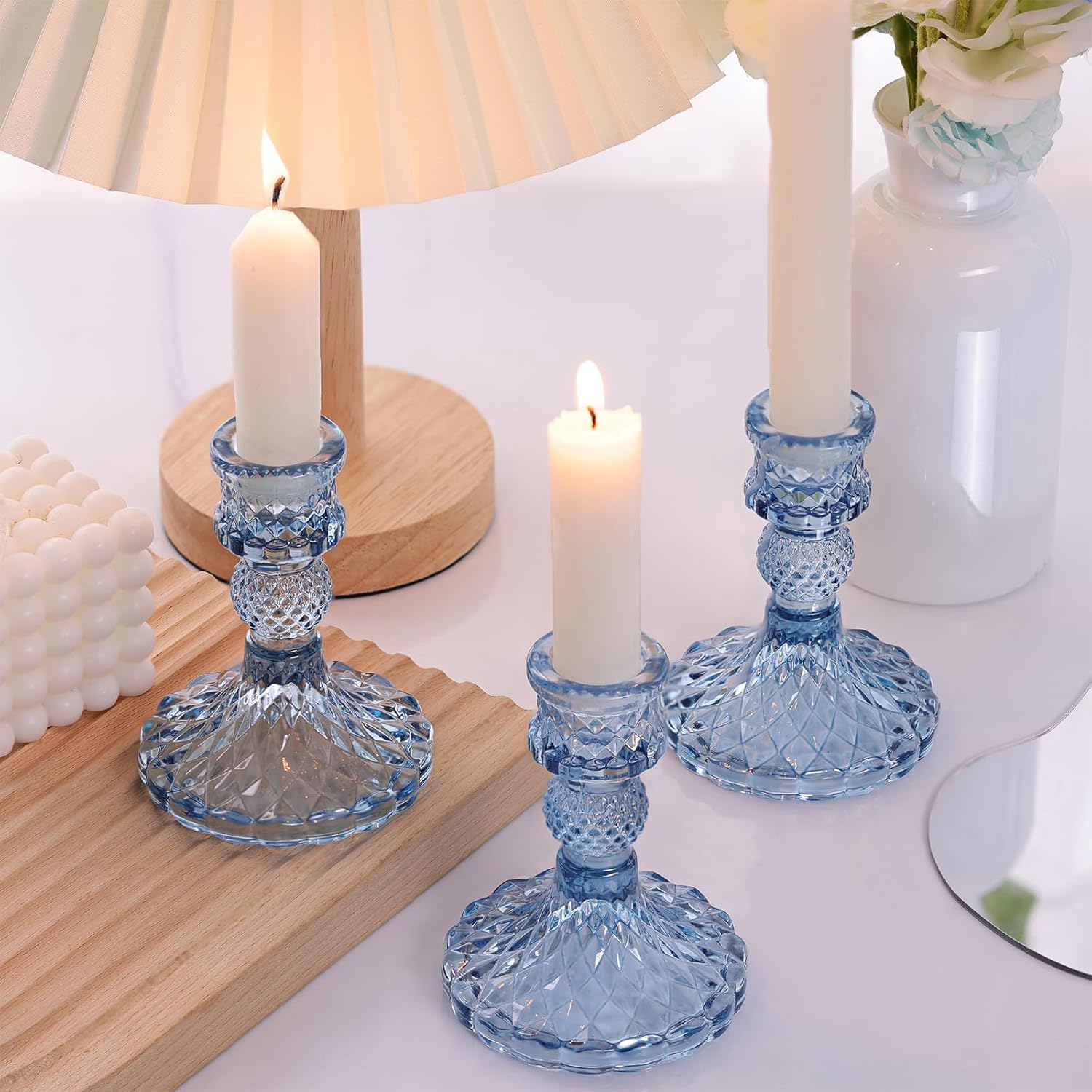 - Candlestick Holders Set [CANDLE EXCLUDED)-- Universal Taper Size: Top inner diameter 0.78'', bottom diameter is 3.15''x 4''H. You will receive 12pcs blue taper candle holders, they fit most standard taper candles, chime candles and flameless colorful LED candles. [NOTE]You wanna candles stands straight? Melt the bottoms of the candlesticks into the holder and hold it in place for 10sec! And drip wax is also very easy to clean.
