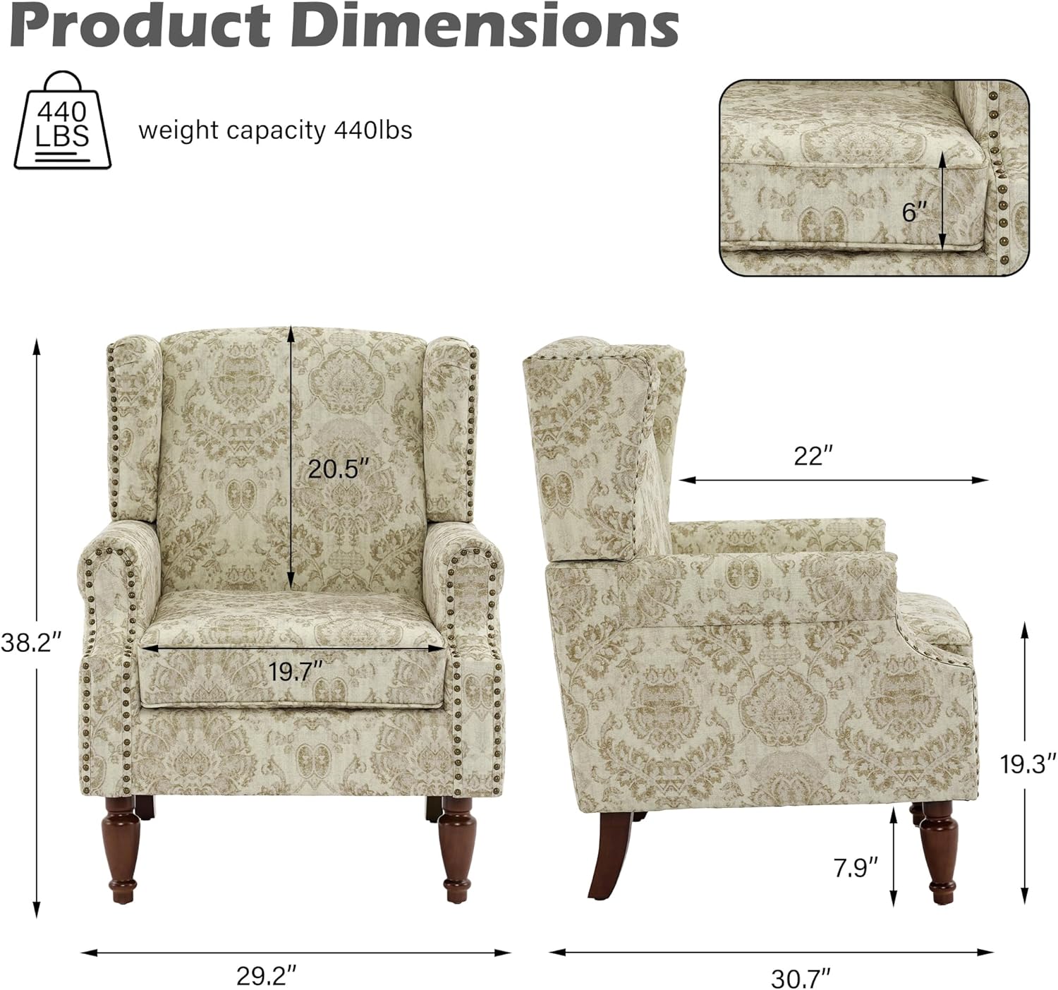 - Size Dimension - Overall Product Dimension: 30.5"D x 29"W x 38"H. Seat Dimension: 22"D x 19.5"W x 19.2"H. Weight capacity: 400 lbs. The spaciousness creates a comfortable environment for resting or working. ATTENTION: Take the backrest Rigt Wing and Left Wing out from the bottom space of seat.