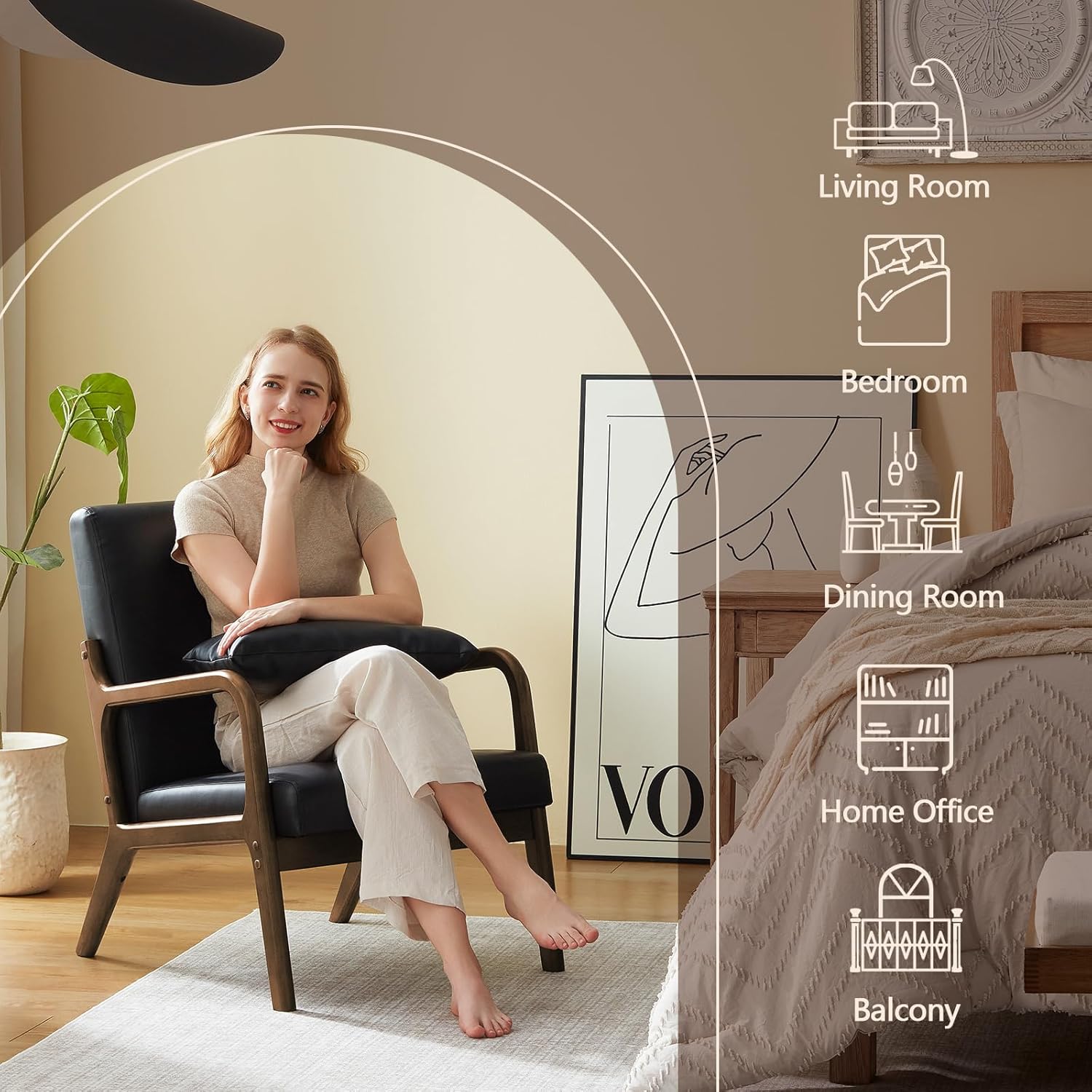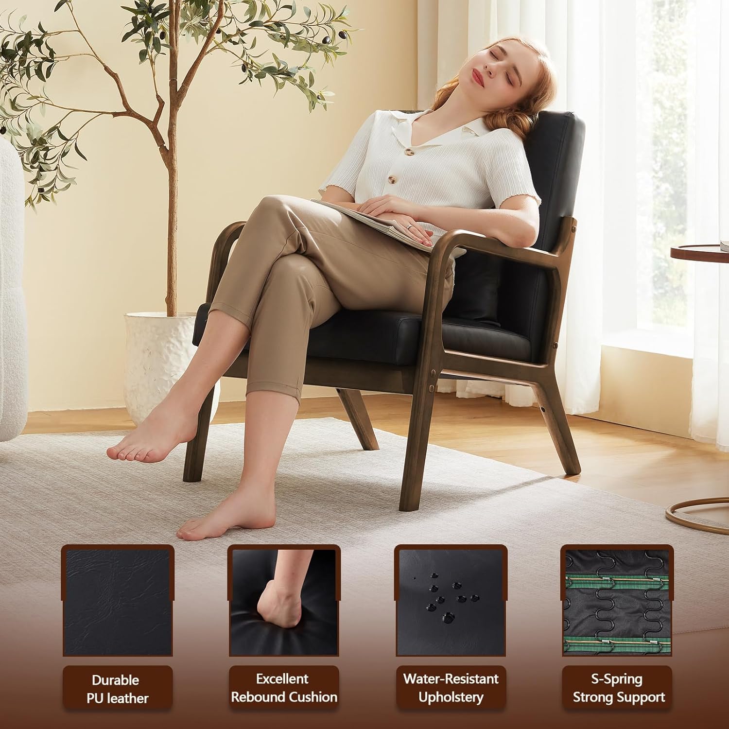 - Mid-century Modern Style:The Mid Century Modern Chair combines durability with ultimate comfort, making it the perfect addition to any room. Wrapped in water-resistant PU leather and supported by sturdy rubber wood legs, this chair is both stylish and easy to maintain