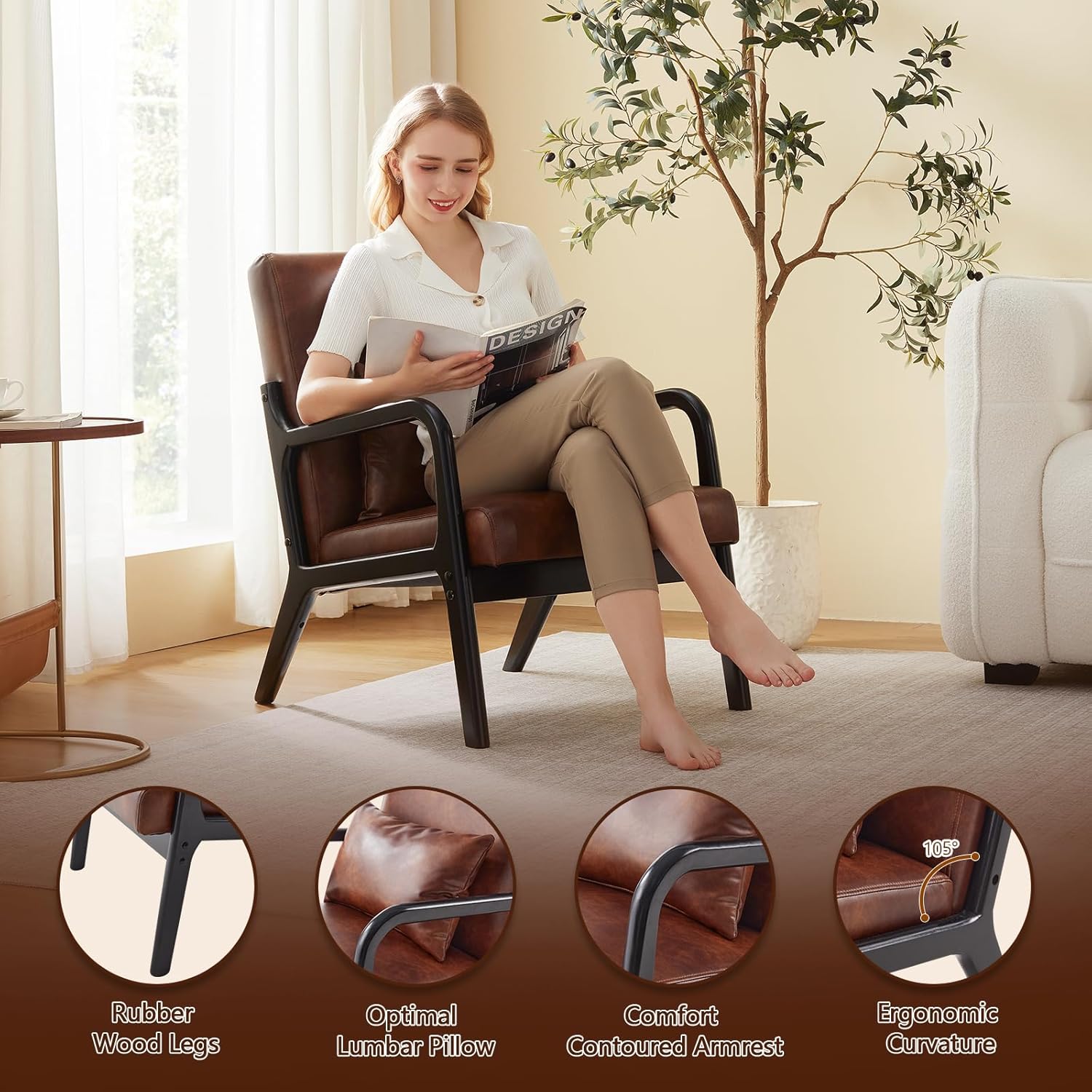 Accent Chair Mid Century Modern Armchair with Lumbar Support Pillow Wood Legs PU Leather Upholstered Lounge Chairs Comfy High Back Cushion for Living Room Bedroom