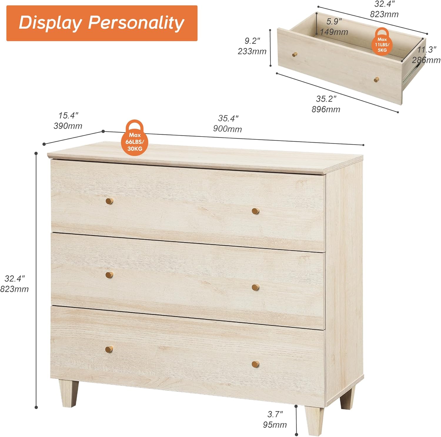 - 3-Drawer Dresser: There are 3 wide wooden drawers that slide easily on ball-bearing sliders, the gold-coated metal knobs allow you to push and pull the drawers without effort, keeping your clothes or other items neat and tidy. 35.4"x15.35" wide tabletop also provides ample storage space to display family photos, plants, books, or other daily items; Note: In order to pass the anti-tip test, the drawers can be pulled out around 7.48 inches at most