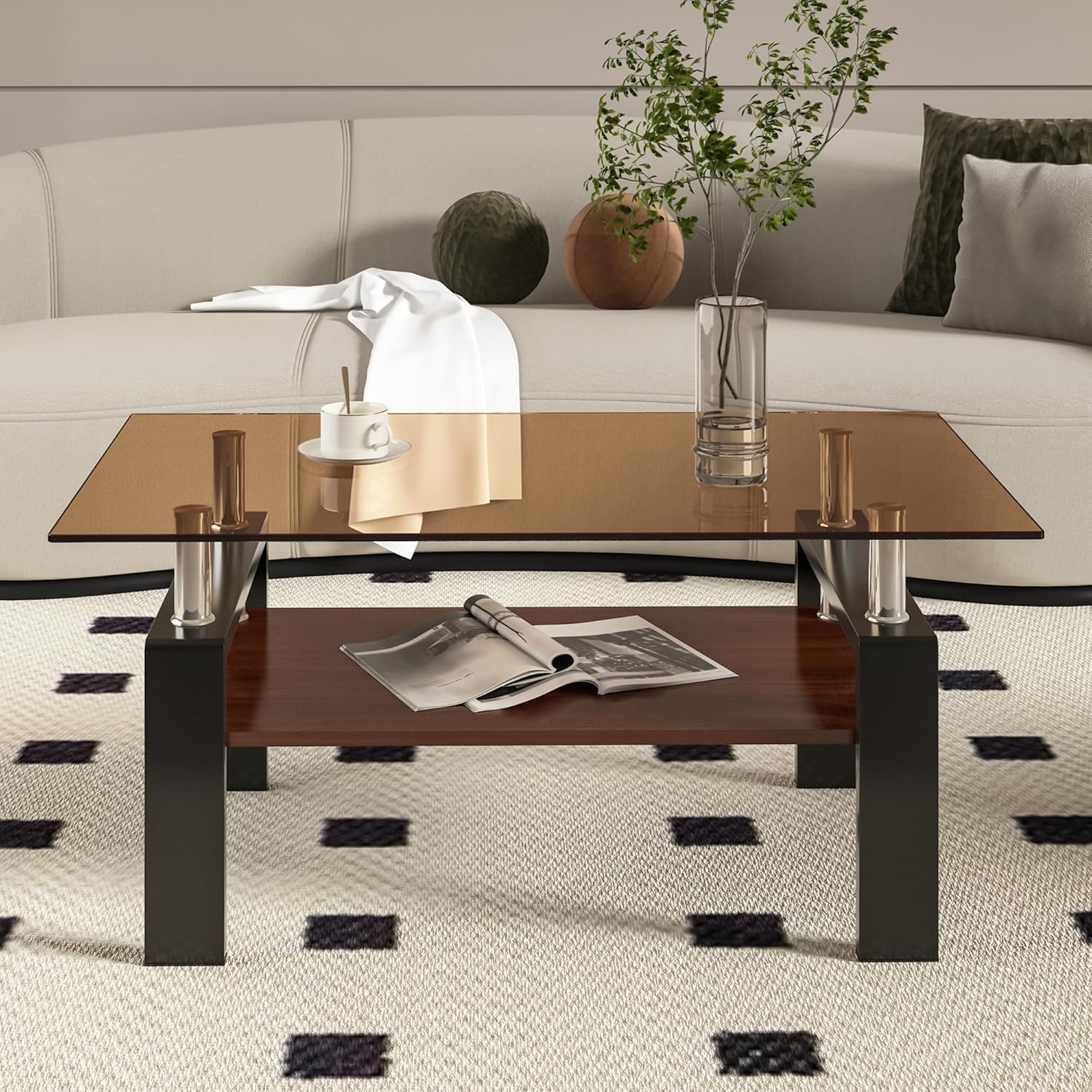 - Tempered Glass Top: The brown glass adds a touch of modern sophistication to your dΓ©cor. Its sleek surface is not only stylish but also easy to clean. Smooth edges to ensure enhanced safety.