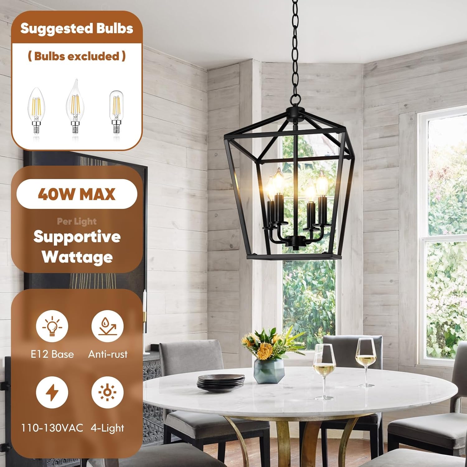 - ✔【Statement-making Light】The black chandelier with 4-light interior candelabra provides abundant light to your home while lending a rustic flair in an iconic lantern silhouette. With its dense modern farmhouse style, it is both a lighting fixture and a great decoration in any space like dining room, kitchen island, living room, bedroom, hallway and foyer. Great choice for your home decor.