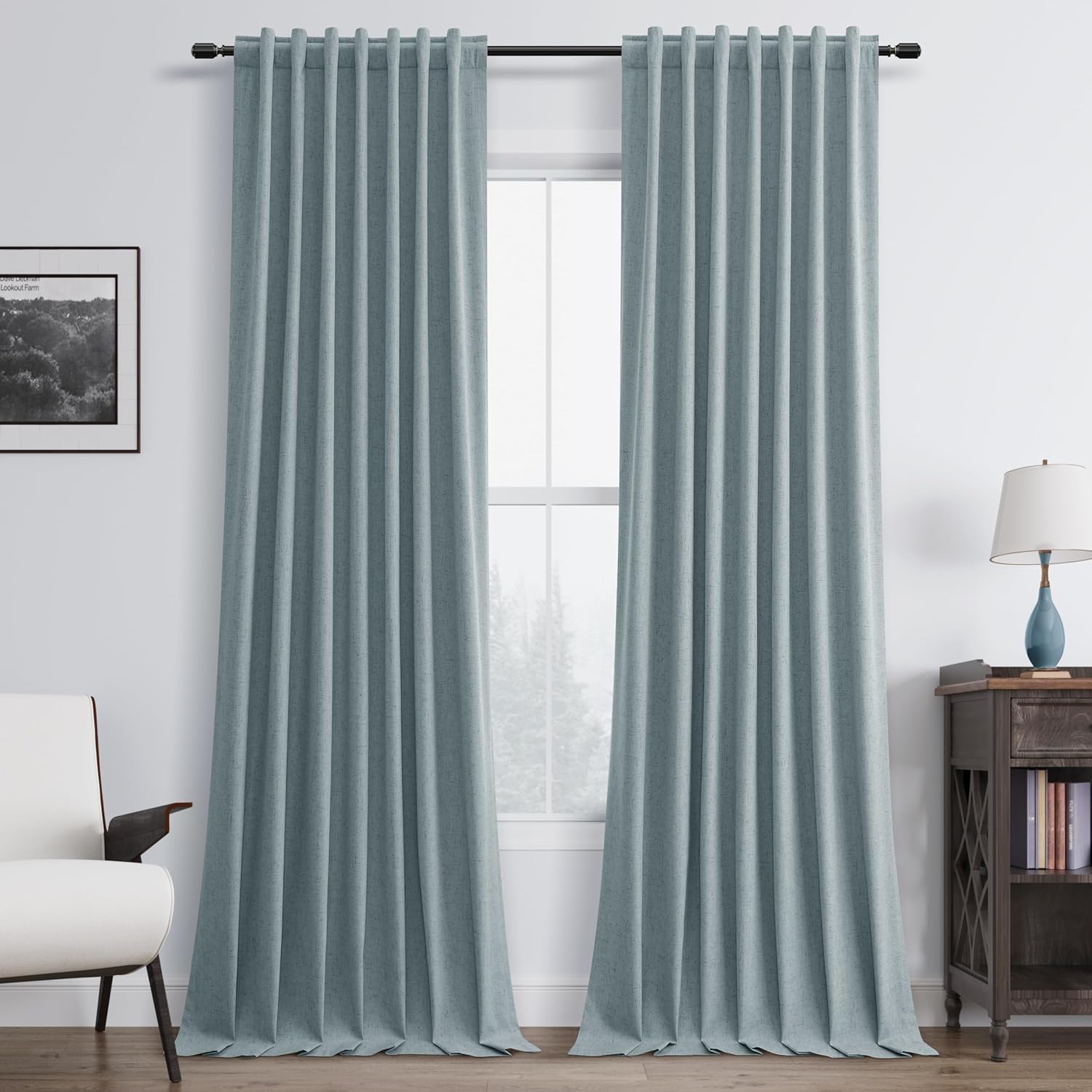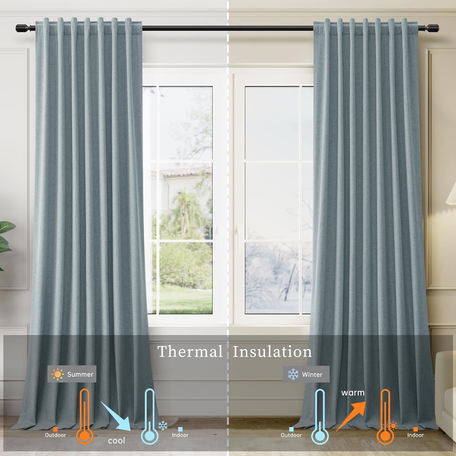 BOODII 108 Inch Black Out Curtains 2 Panels Set Back Tab Thermal Insulated Natural Linen Textured Blackout Curtains Noise Reducing Stone Blue Neutral Living Room Darkening Window Drapes 52x108