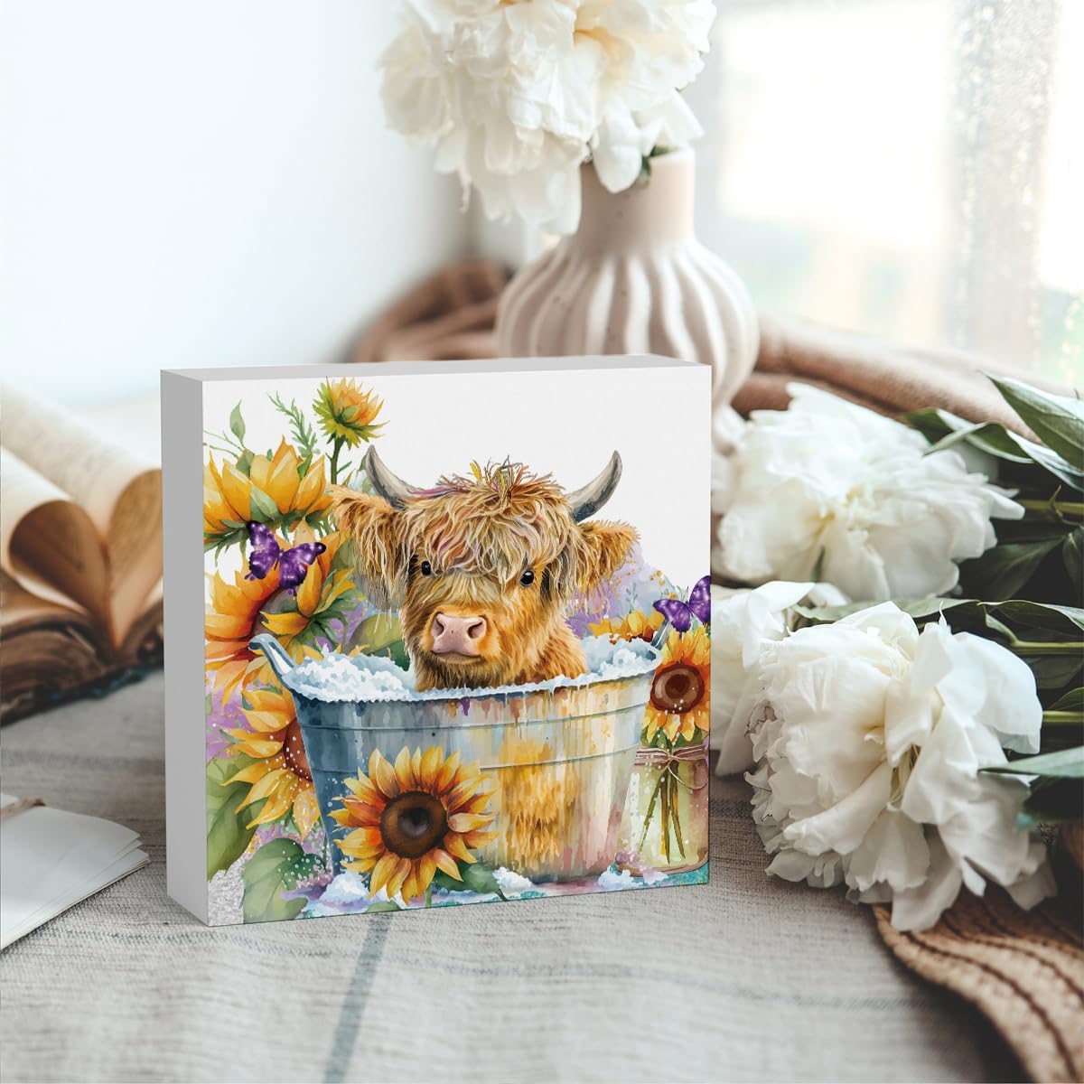 Highland Cow Funny Bathroom Decor, Highland Cow Gifts, Highland Cow Decor,Highland Cow Nursery Decor,Wooden Box Decor Sign for Home Farmhouse Office Living Room Table Shelf Tiered Desk