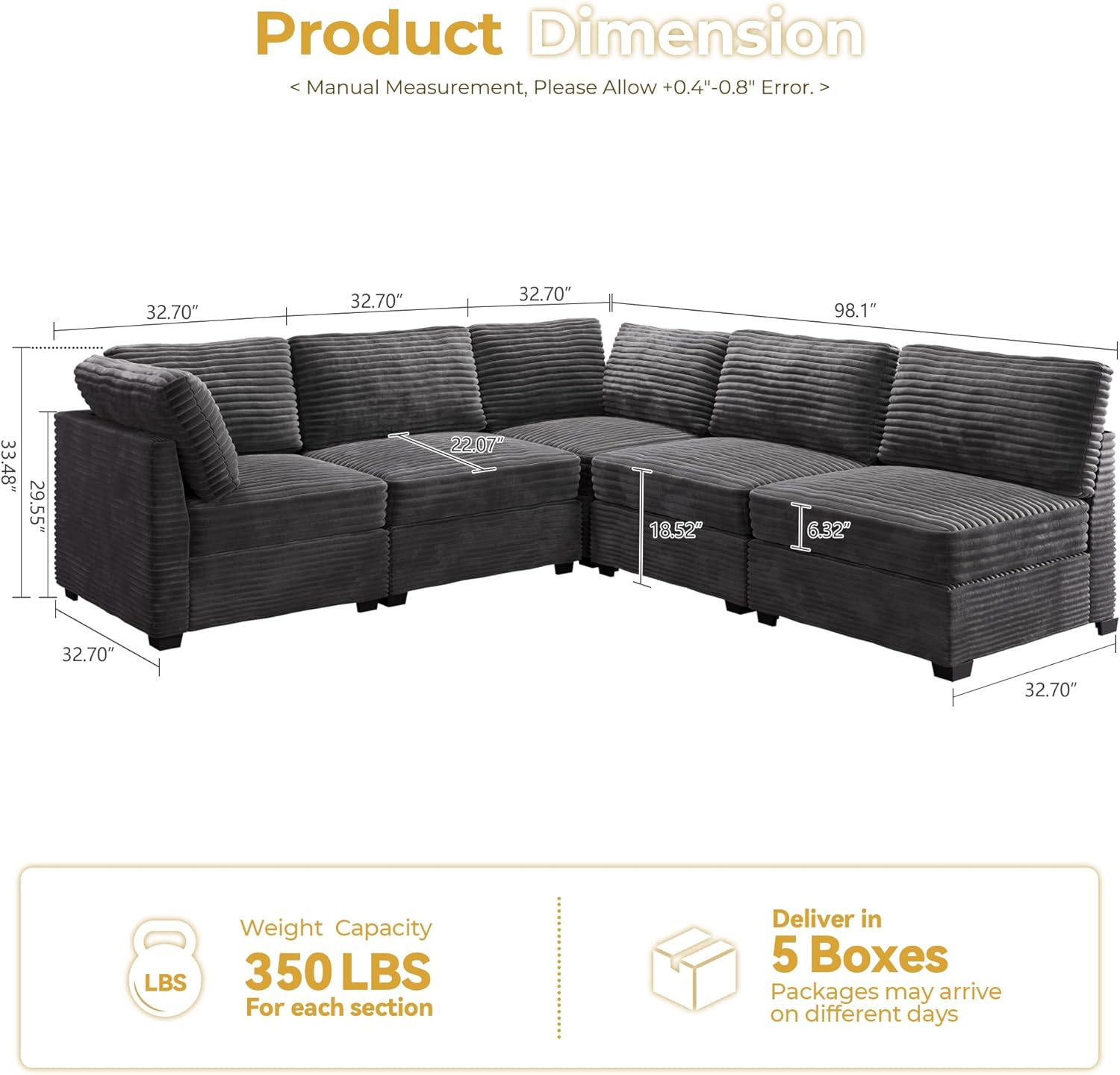 HOOOWOOO Modular Sectional Sofa,5 Pieces Sectional Couches for Living Room,98X98 L Shaped Cloud Couch Set(Grey Velvet Corduroy)