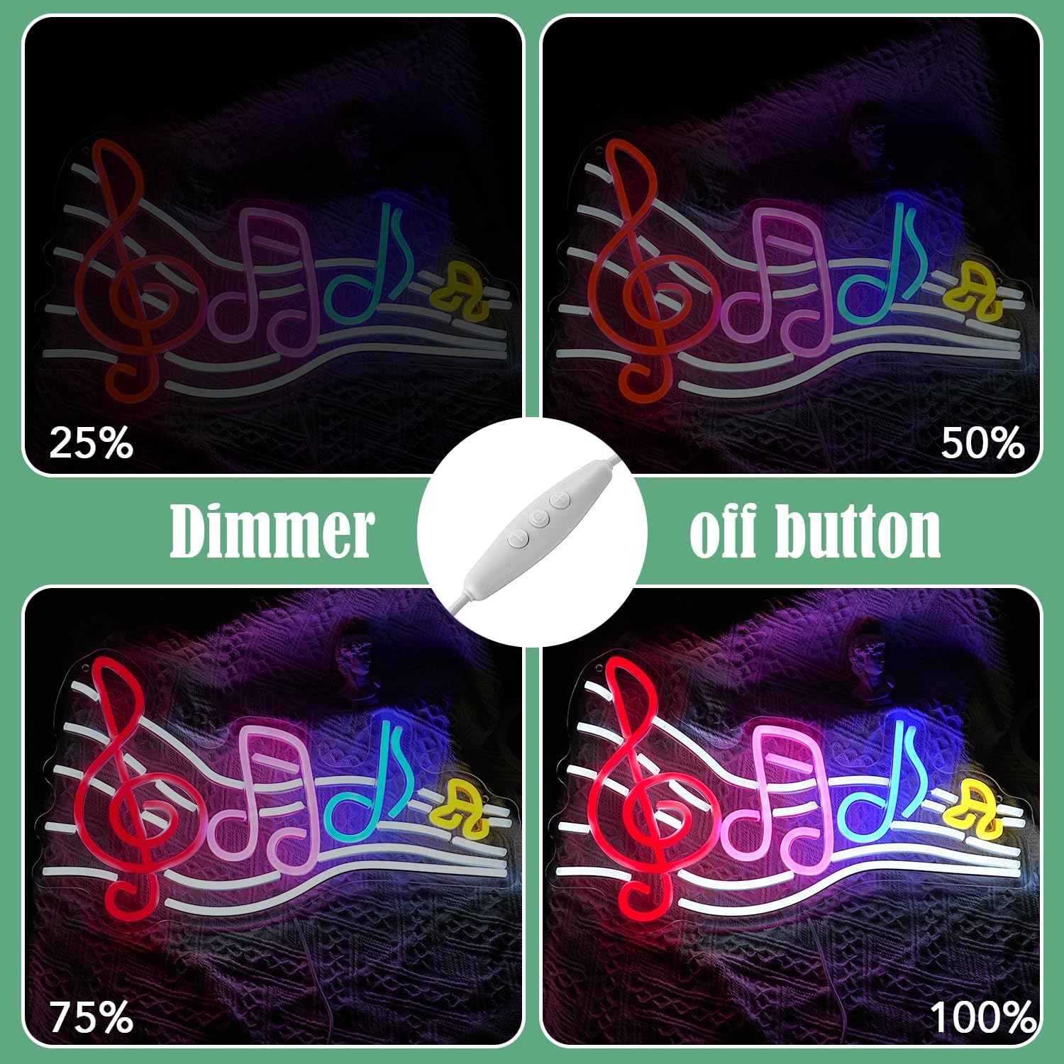 - USB power supply and dimmable switch: The music neon signs are powered by USB, with a 78 inch power cord that can be turned on through a plug, power bank, computer, charger, etc. The dimmer switch has three buttons, the middle control switch, and the up and down buttons can control the brightness of the light (10% -100%), which can be adjusted according to your needs for the atmosphere