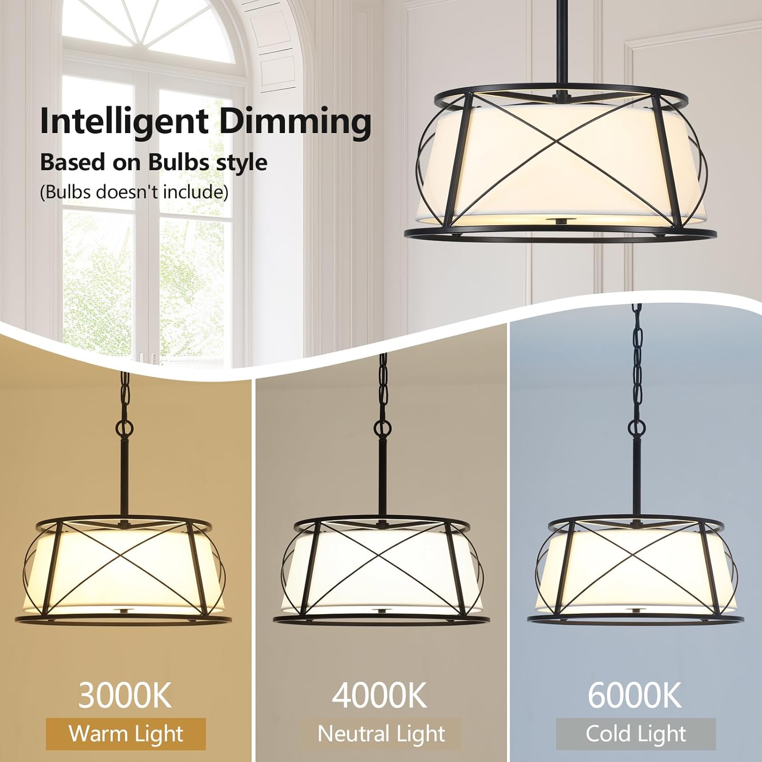 - 【Modern Drum Chandelier】The unique shape of the drum chandelier matte black cross-line hollow frame and white fabric drum shade, modern and elegant design, unique and exclusive styling design, full of artistic sense. placed in your home's kitchen, dining room, hallways and other rooms will become focal point of decoration