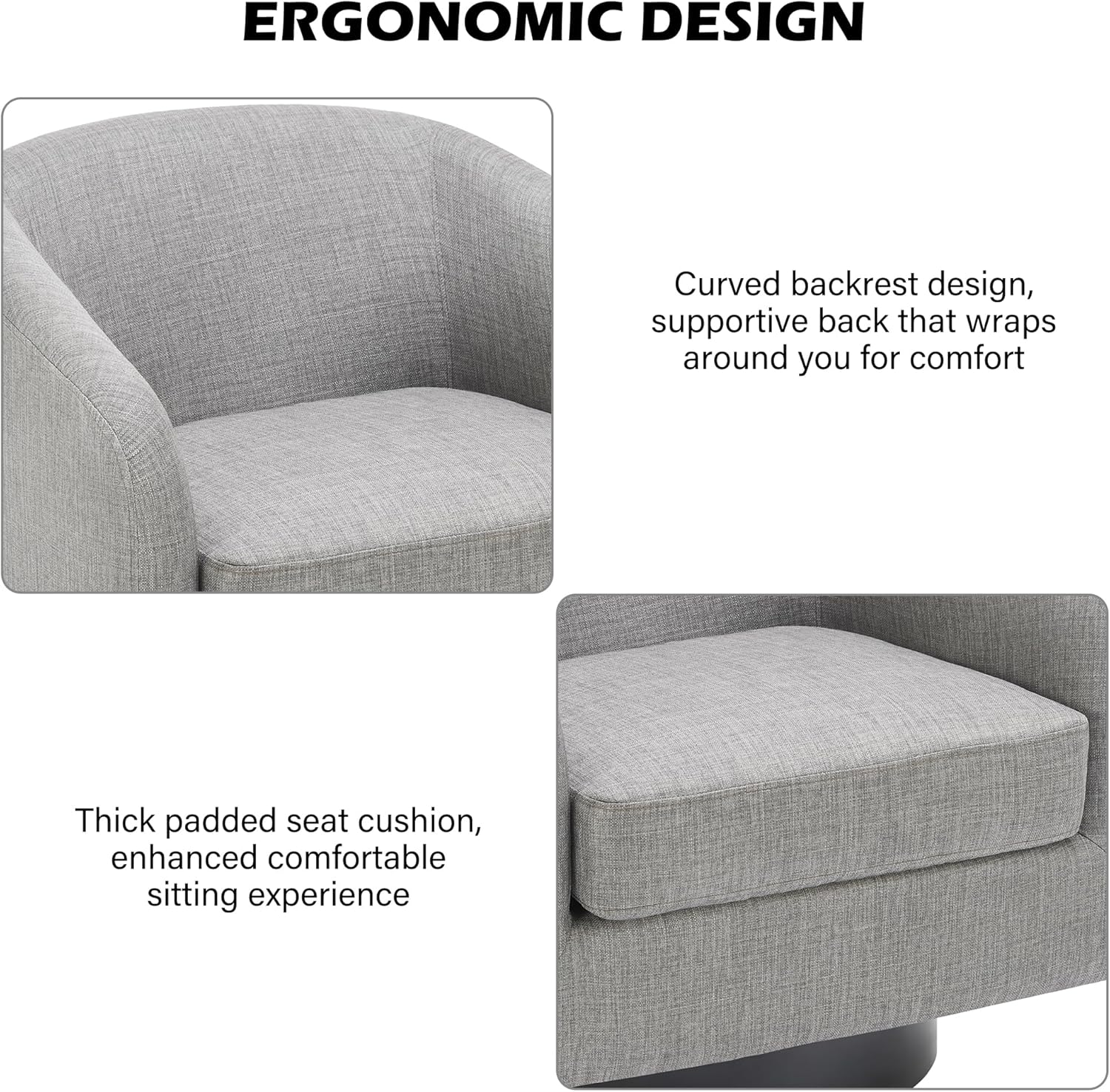 - 360 Degree Swivel Barrel Chair: This 360 degree round swivel chair designed for your leisure comfort. Heavy solid turntable, making it more stable and not wobbly