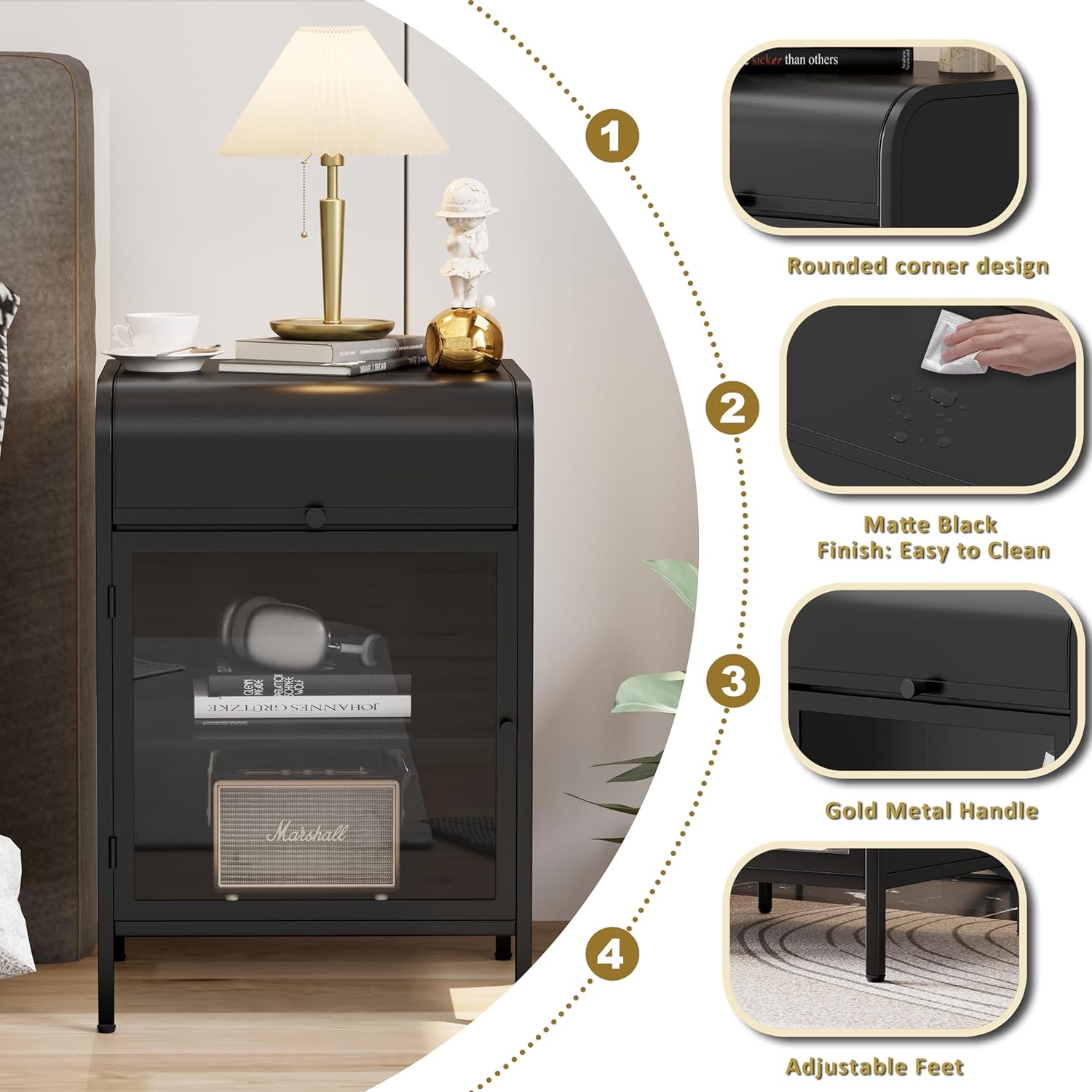 - Stylish Glass Door:Enhance your bedroom decor with our nightstand's chic design. The transparent glass door adds a unique artistic touch, while the metal frame features a sleek matte finish, effortlessly matching any room style. It combines modern and mid century element makes the room look more stylish