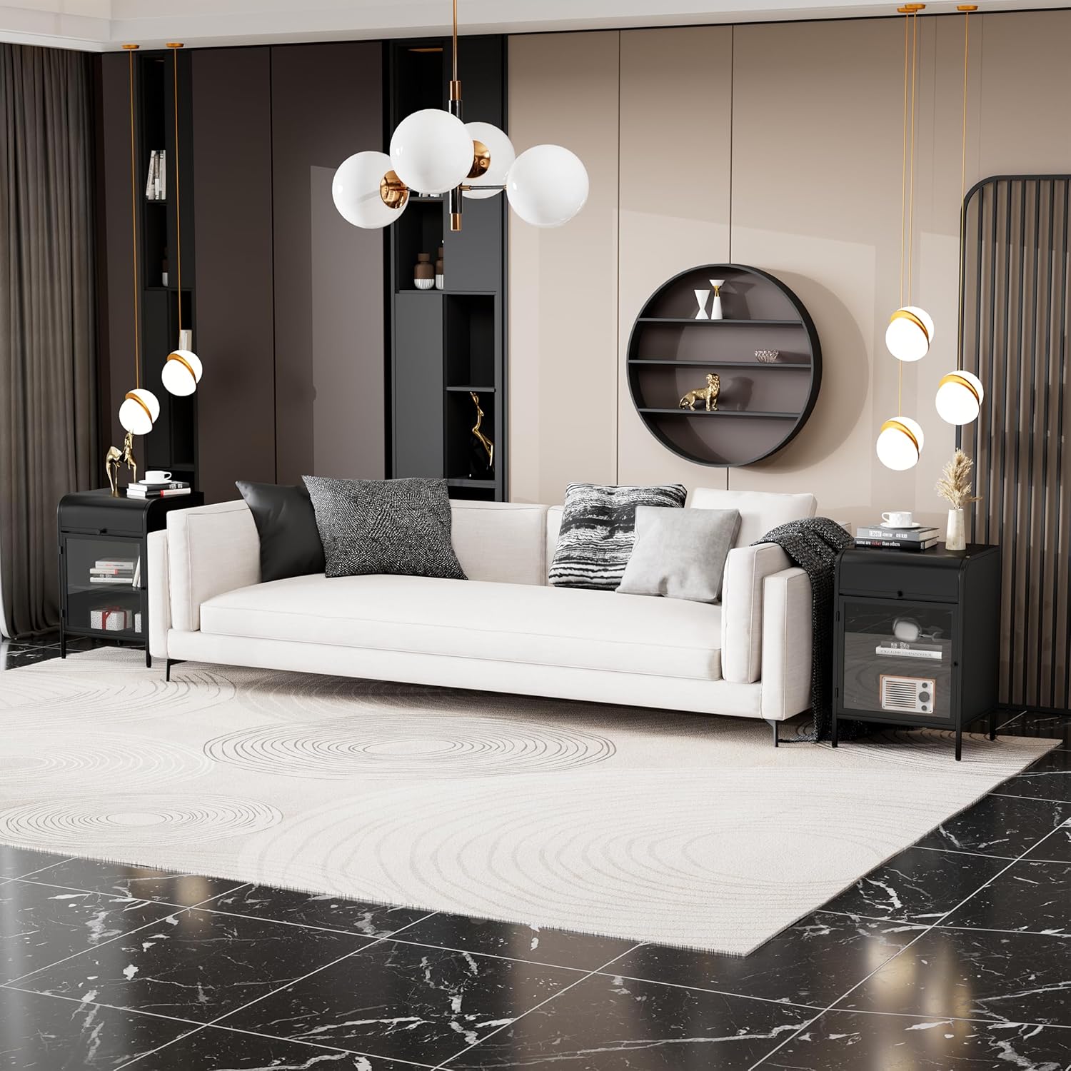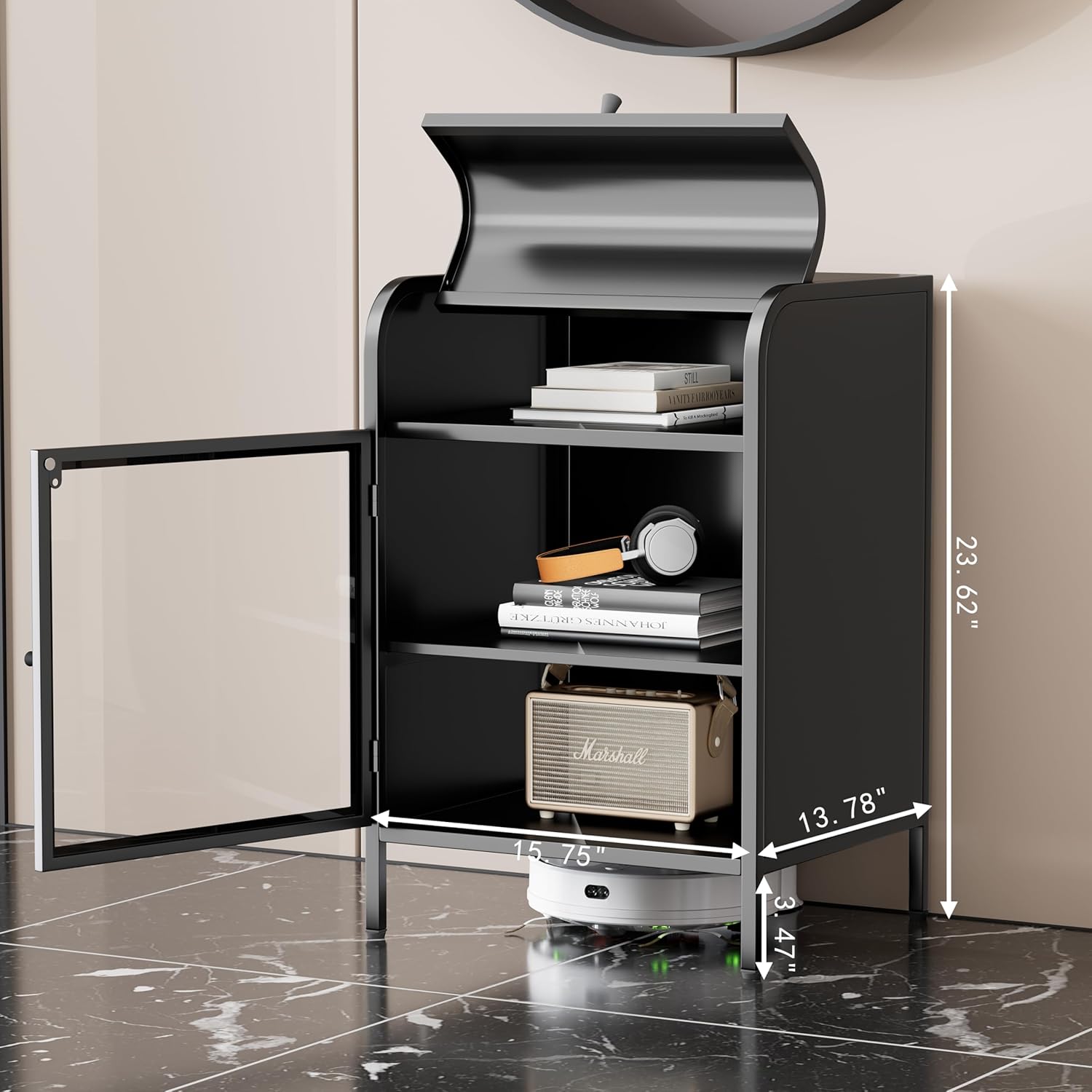 - Slim yet Spacious: Though with a slim figure of 13.78”D x 15.57”W x 23.62”H, each end table is complete with ample storage. Set a cup of coffee and a flower vase on the top and books on the bottom shelf to give your faves a cozy landing spot