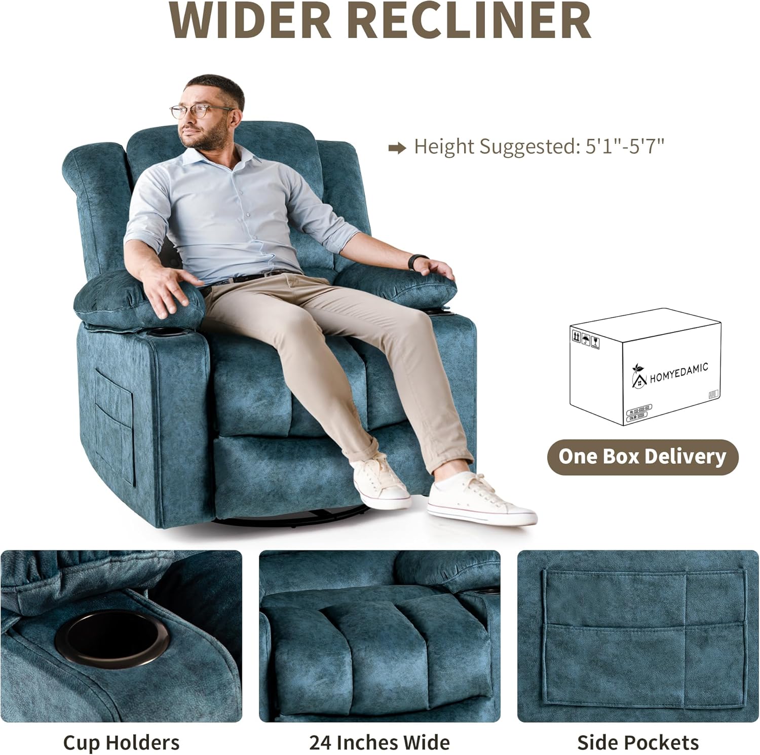 - Wider Recliner - The HOMYEDAMIC oversize recliner features a larger metal frame with a seat width of 24 inches (other recliner seats are 21 inches wider), with self-developed foam and highly breathable fabric.