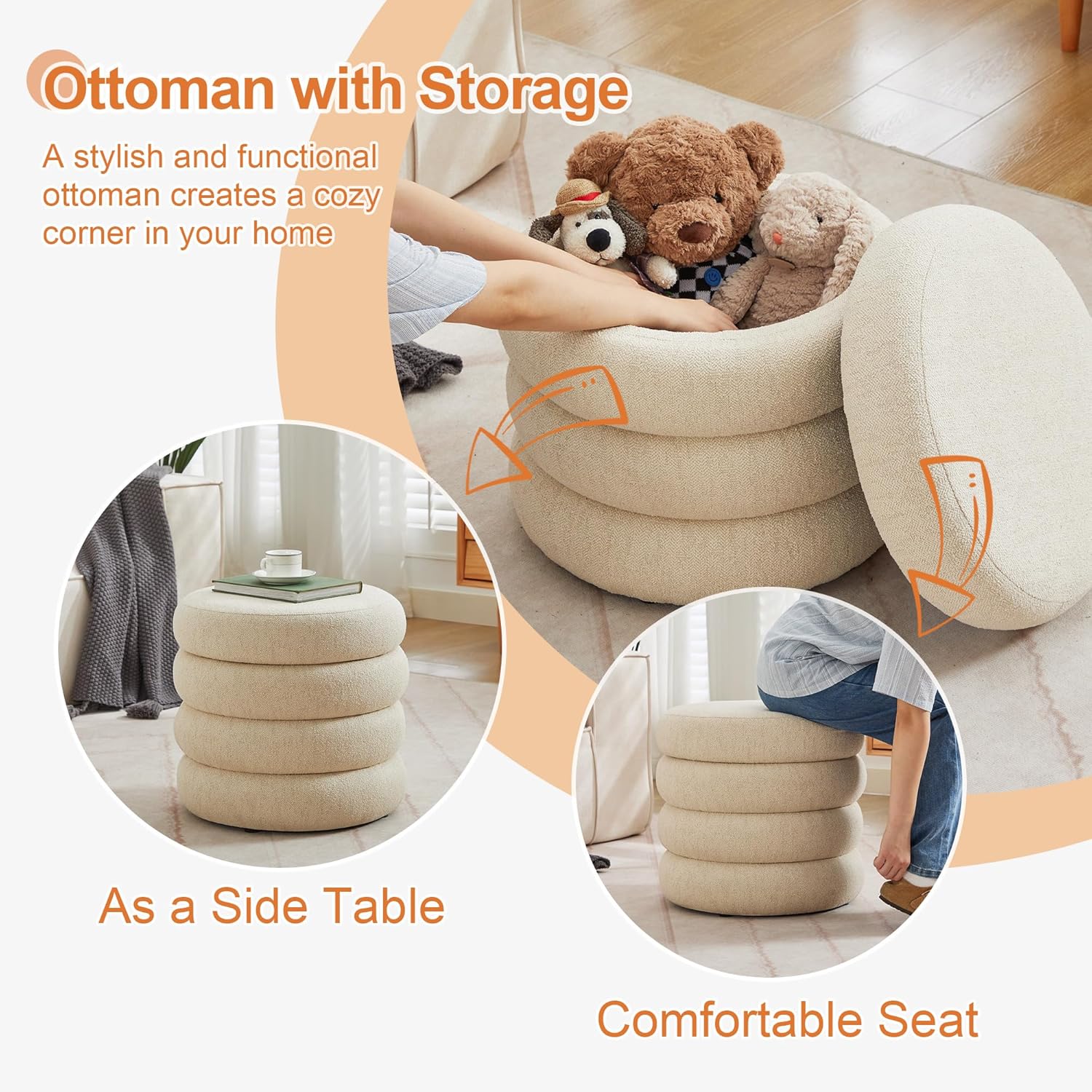 - [Ottoman with Storage] The removable lid reveals a finished storage space, perfect for organize your belongs in style, such as books, blankets, shoes, remotes, kid's toys, random objects, etc. It can even be a rest place for your cat or other pets