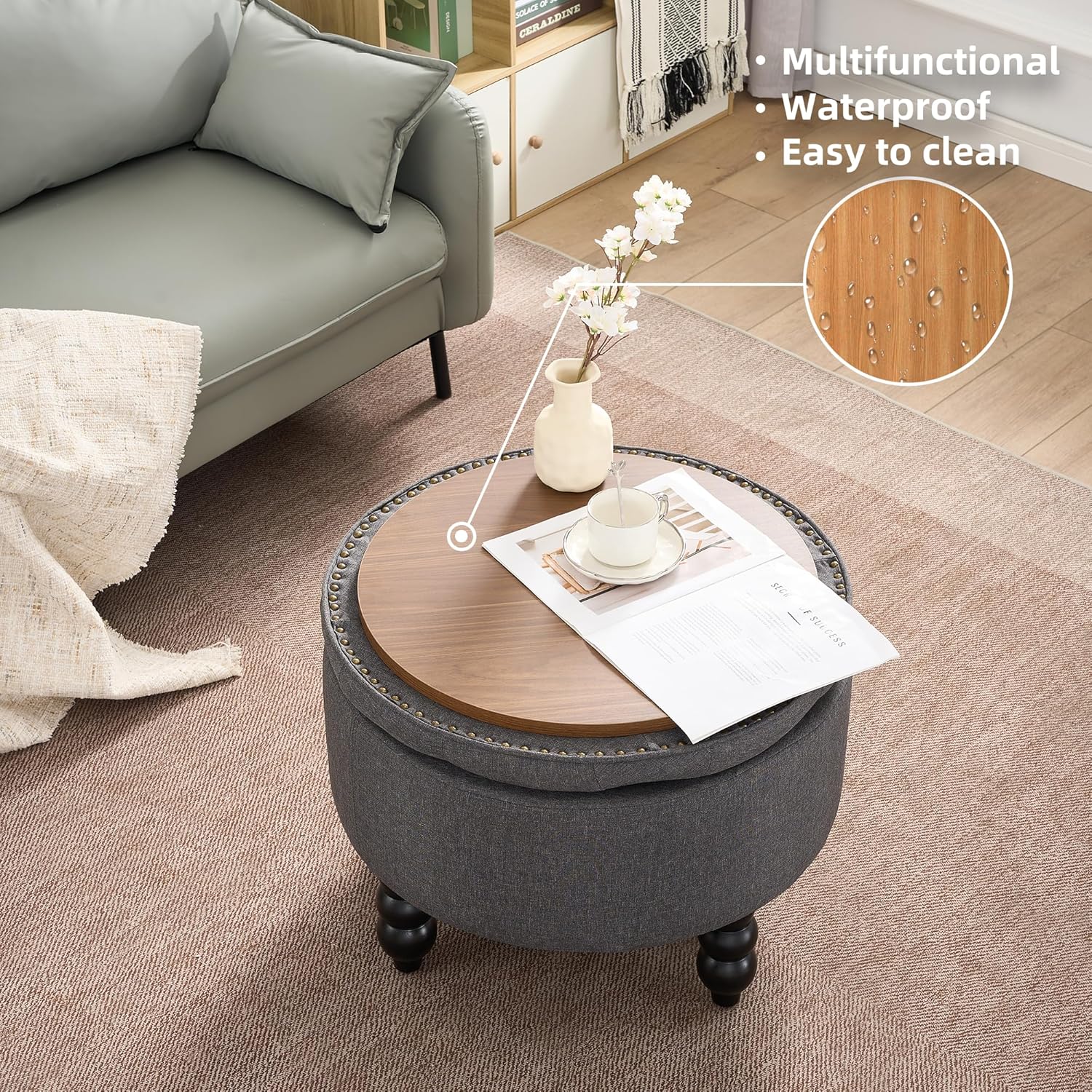 Fabric Round Ottoman with Storage, Upholstered Tufted Storage Footstool, Modern Wooden Coffee Table for Living Room, Bedroom, Dark Grey