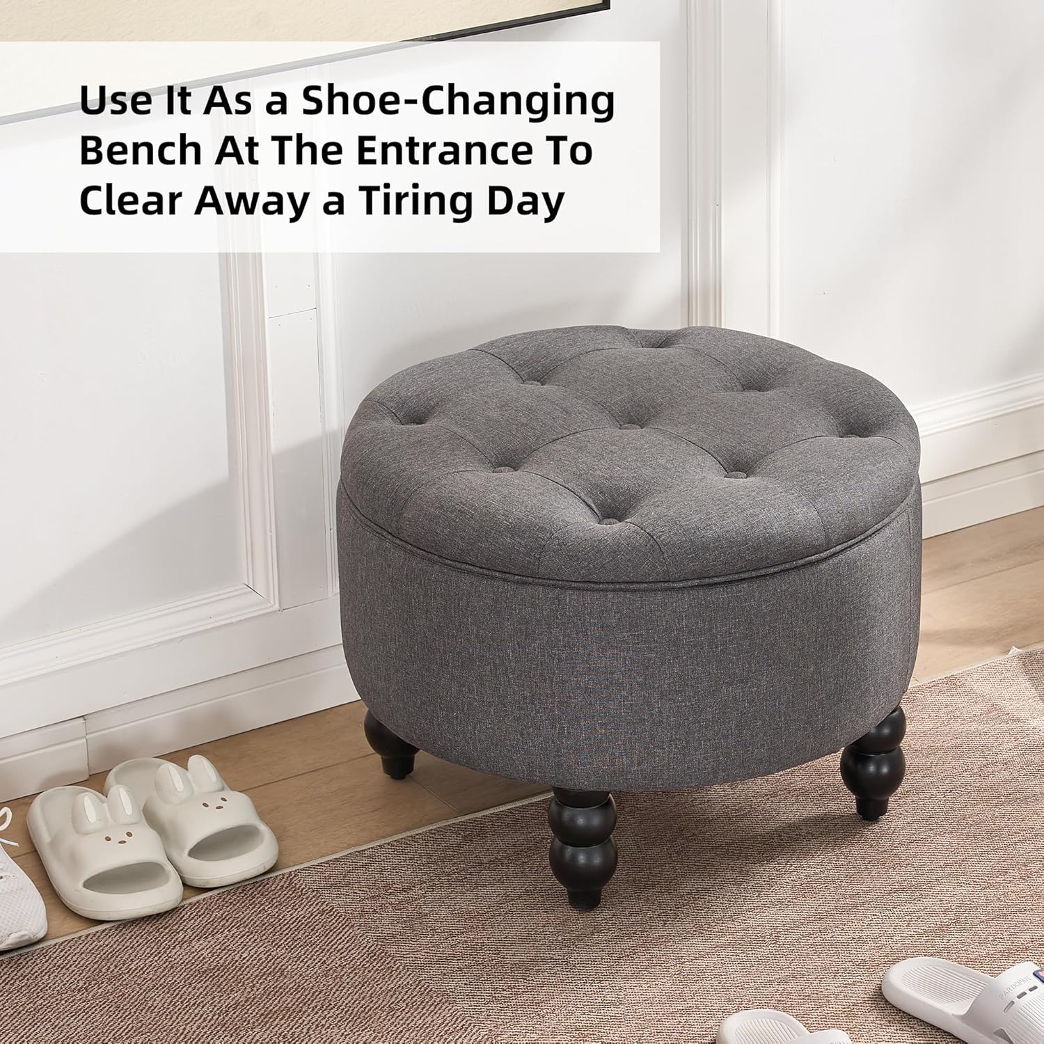 - COMFORTABLE FABRIC: This storage footstool is wrapped with soft and breathable linen material, the cushion is filled with high-density sponge, round ottoman stool is not easy to collapse after sitting for a long time, upholstered round ottoman is soft and comfortable, and the back of the lid is a solid wood board, waterproof and sturdy.