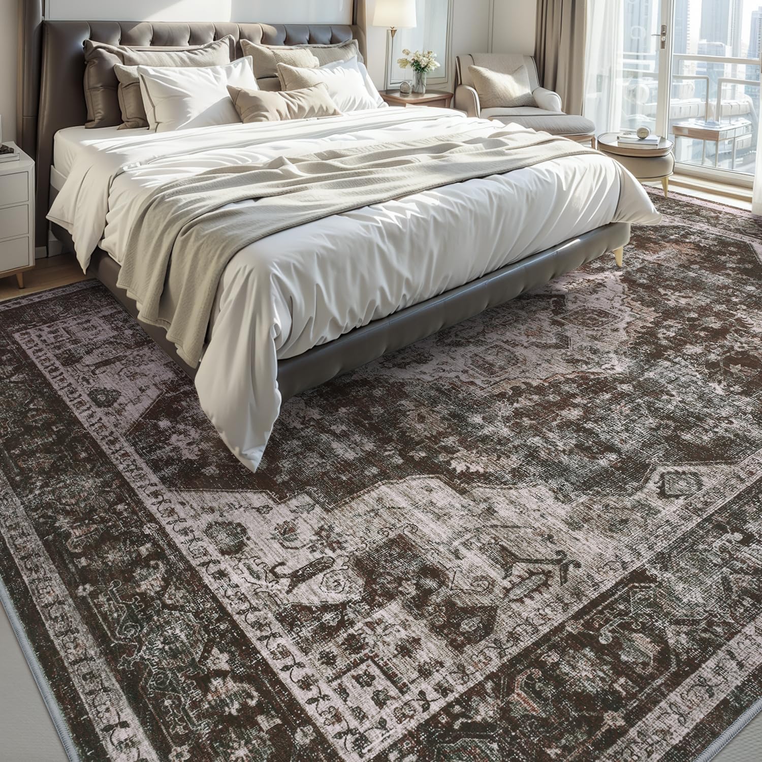 AMOAMI-3X5 Area Rug-Soft Washable Vintage Throw Accent Rugs for Living Room, Entryway, Bedroom, Kitchen, Bathroom, Laundry Room, Kitchen, Bathroom, Bedside, No Slip Brick/Brown