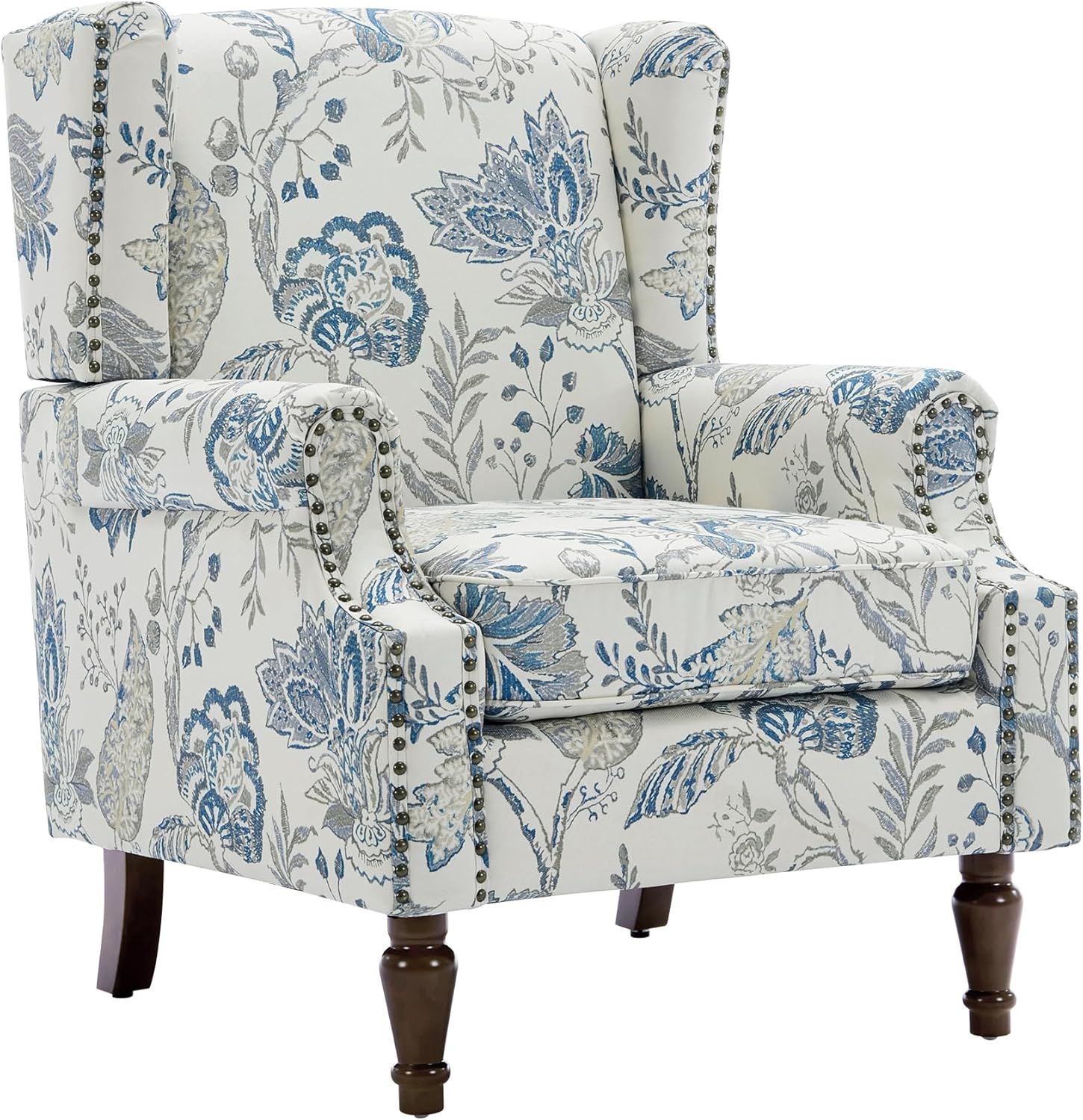 UIXE High Back Floral Accent Chair, Upholstered Armchair in Fabric, Retro Printed Wingback Arm Chair for Living Room, Nailhead Trim Single Sofa Bedroom Reading Seat - Plants Blue