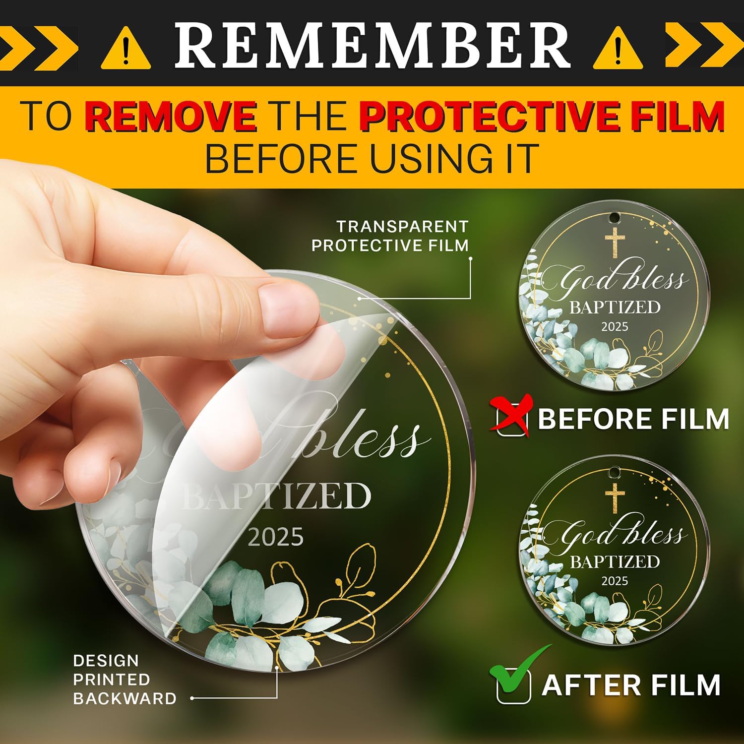 - ACRYLIC MATERIAL: Made from acrylic with a transparent protective film on the front to prevent scratches. The design is printed on the back, and to fully appreciate the ornament's beauty, remove the protective film to reveal the clear acrylic finish