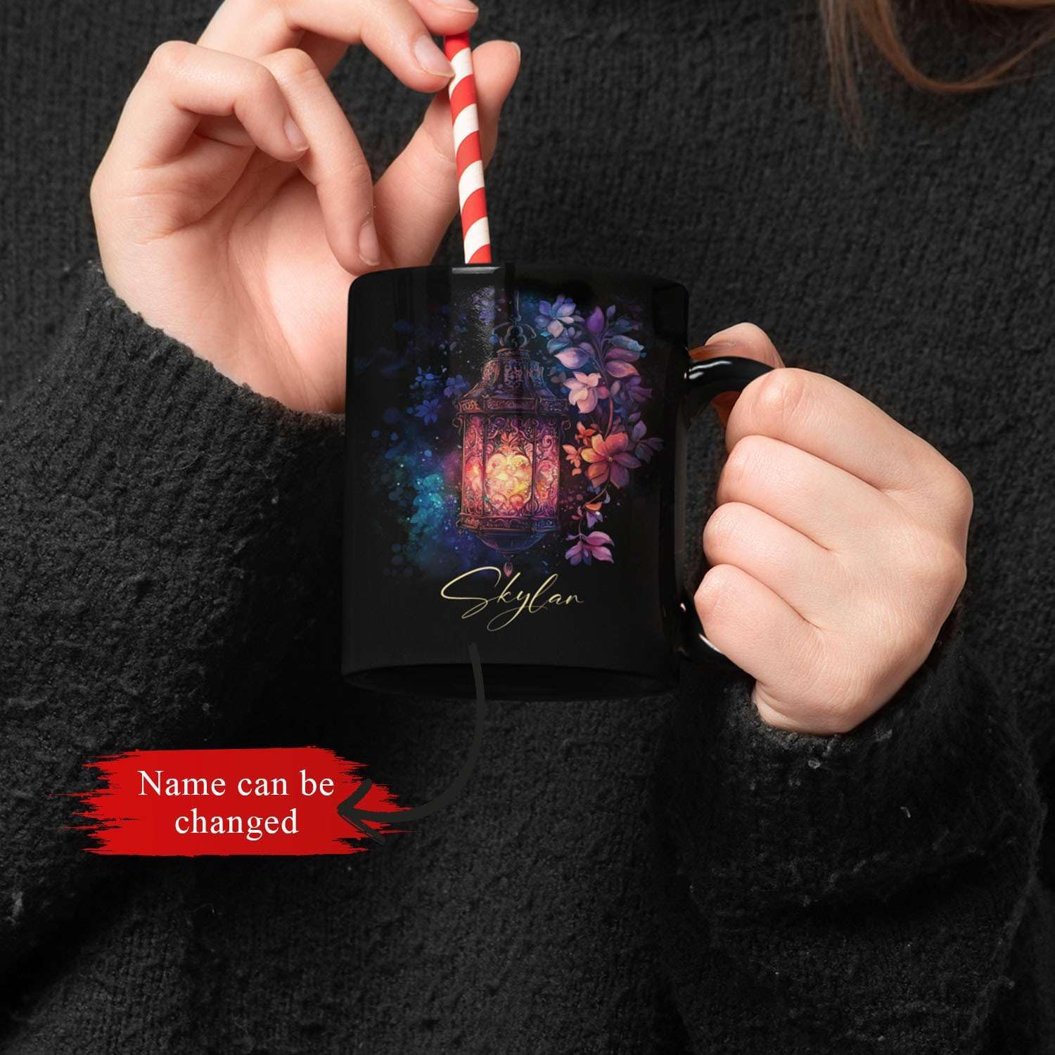 Custom Vintage Lantern With Flowers Coffee Mug, Personalized Name Ceramic Cup 11oz Or 15oz, Glowing Light And Flowers Mug, Customized Enchanted Nature Black Cup, Gift For Friends