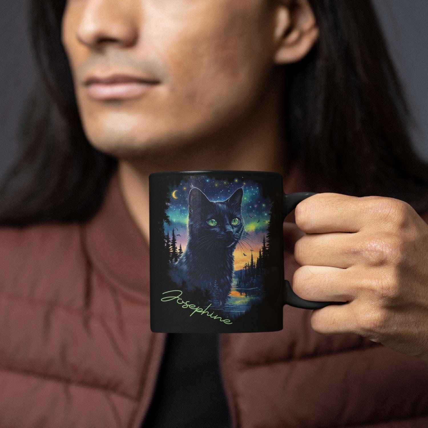 - 💝【UNIQUELY PERSONALIZED】Enjoy your favorite beverage with this Custom Cute Cat Coffee Mug featuring a stunning Northern Lights backdrop. The design showcases a charming cat surrounded by a breathtaking nature scene, gift for animal lovers. This personalized black ceramic mug can be customized with a name, making it a thoughtful gift for pet enthusiasts. Click "Customize Now" to add a special touch and create a unique gift for any occasion.