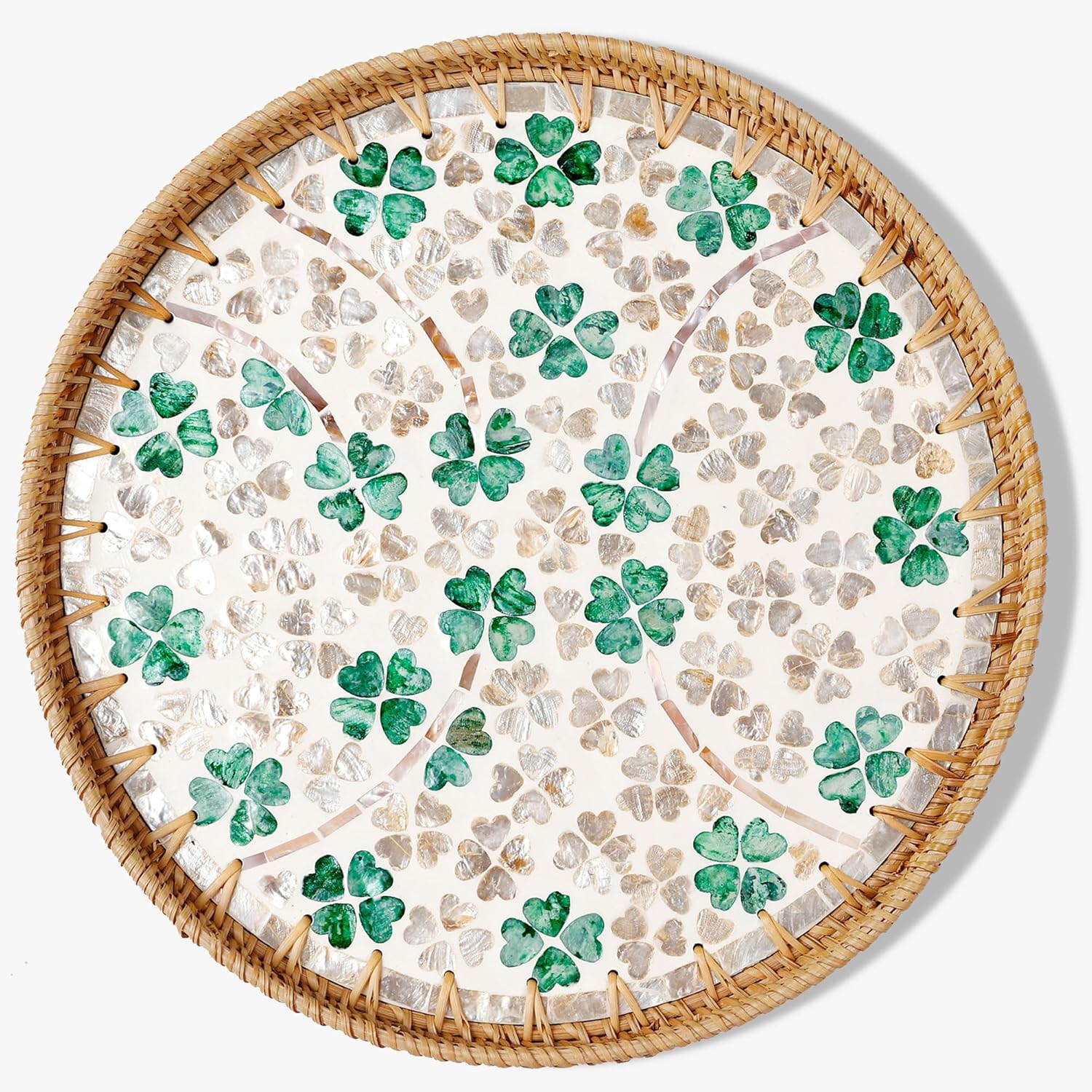 Round Rattan Tray with Mother of Pearl Inlay & Wooden Base - Decorative Wicker Serving Tray for Coffee/Bread/Fruits, Food Storage & Display - Multipurpose Home Decor (M,Four-Leaf Clover)