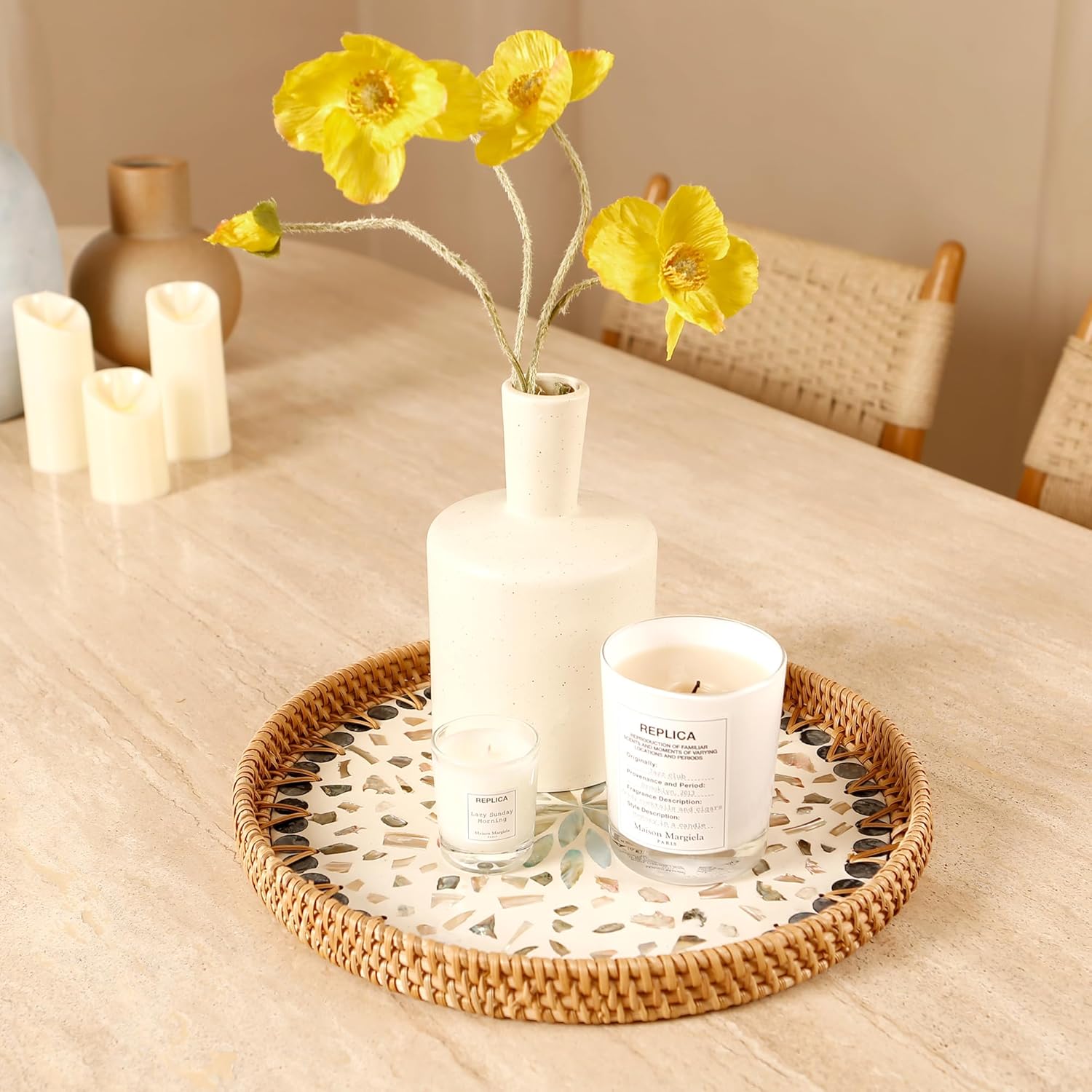 - Natural Rattan and Seashell Design: This tray is crafted from high-quality natural rattan, handwoven with beautiful seashell inlays at the base, showcasing a blend of natural materials and artistic craftsmanship