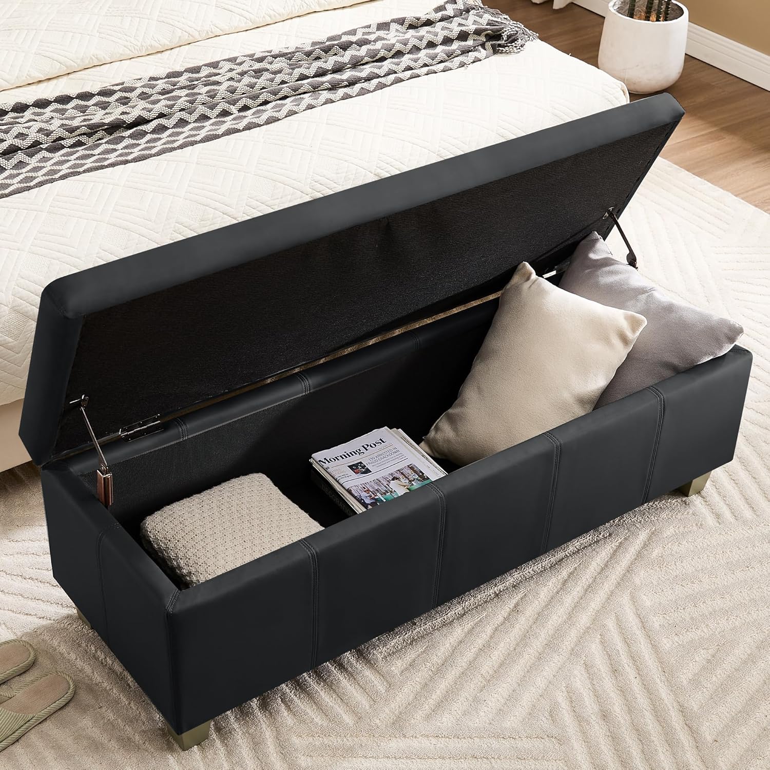 - PREMIUM MATERIALS: Our storage ottoman crafted with premium faux leather and sturdy wooden leg, high elasticity sponge filling the seat cushion, which is waterproof and wear-resistant, this ottoman ensures stability, comfort, and long-lasting quality.