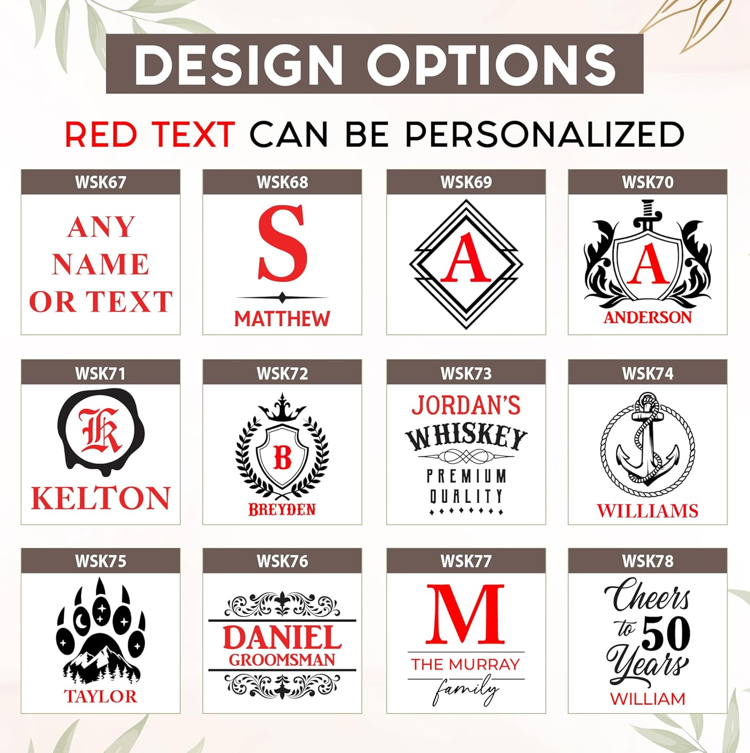 - Customizable Design Options: Choose from 24 design options and personalize your whiskey decanter and glasses with custom text, initials, family names, or meaningful designs. Create a lasting keepsake for your loved one with a unique engraving.