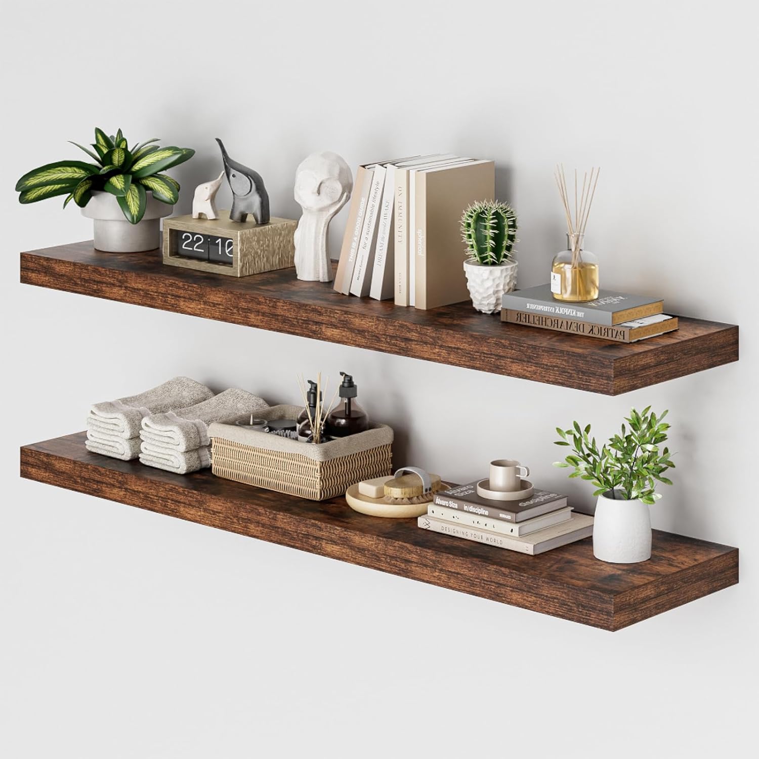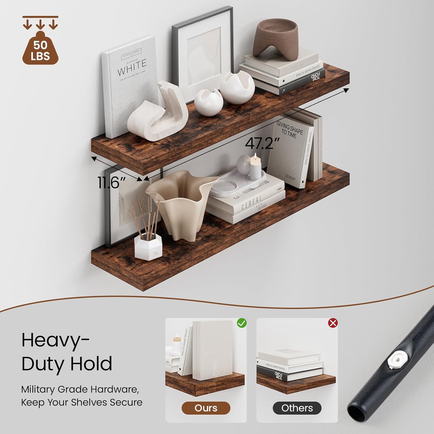 - Extra Deep Floating Shelves: Measuring 11.6” D x 47.2” W x 1.5” H, these shelves are crafted for maximum depth and durability. The spacious 12” depth gives you plenty of room for stylish display, organized storage, and decorative accents. Perfectly suited for your bathroom, kitchen, or living room, they enhance both function and flair in any space!