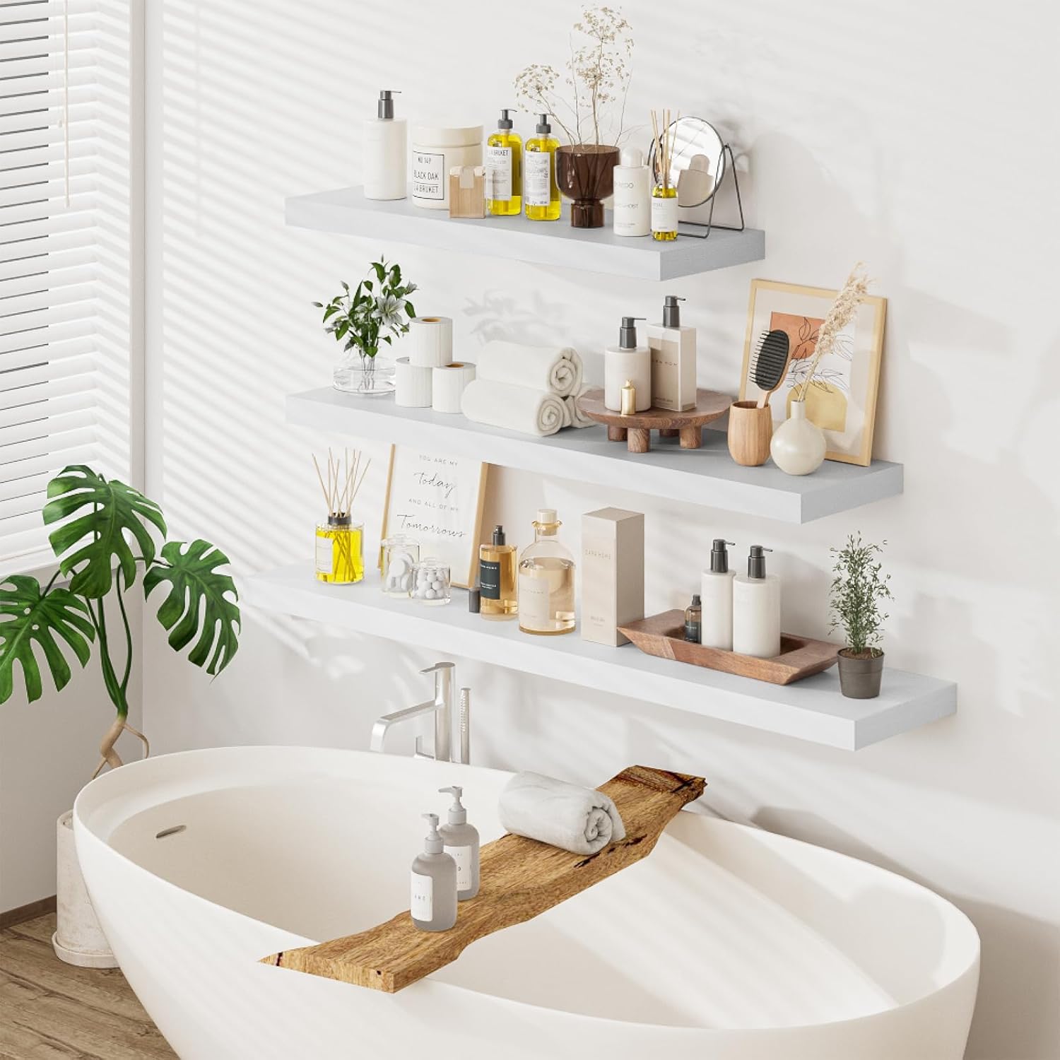 - Extra Deep Floating Shelves: Measuring 11.6” D x 35.4” W x 1.5” H, these shelves are crafted for maximum depth and durability. The spacious 12” depth gives you plenty of room for stylish display, organized storage, and decorative accents. Perfectly suited for your bathroom, kitchen, or living room, they enhance both function and flair in any space!
