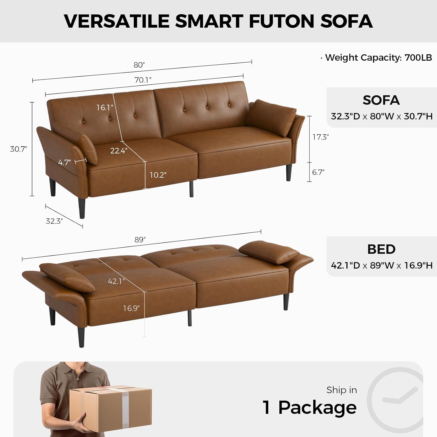89” Futon Sofa Bed, Faux Leather Futon Couch Bed with 2 Square Pillows, Convertible Sleeper Sofa with Adjustable Backrest& Armrests, Modern Loveseat Sleeper for Living Room, Bedroom, Brown