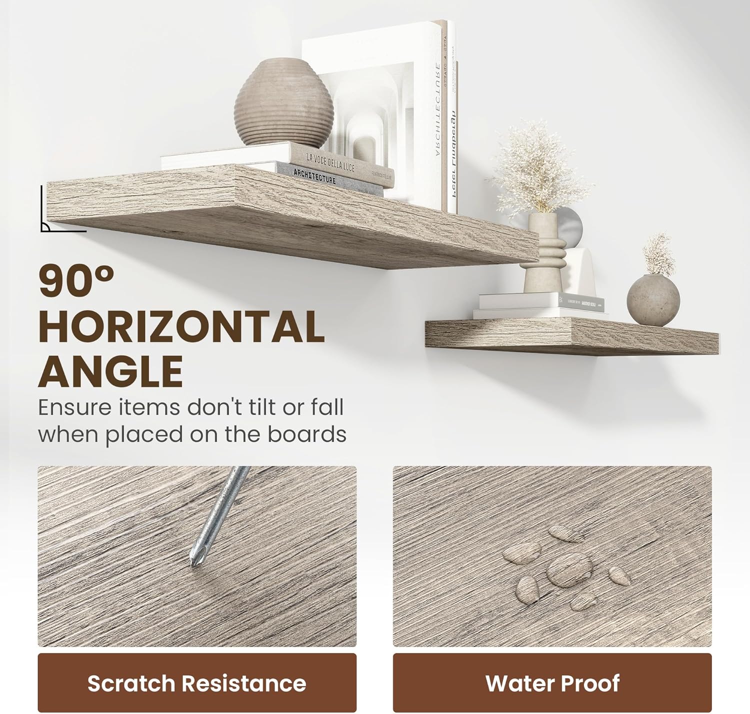 - ăPremium Quality ConstructionăCrafted from high-grade engineered wood with an invisible one-piece bracket, these floating shelves offer a robust and sleek design. The rustic wooden grain finish not only adds a touch of elegance but also infuses warmth into any room, making them a perfect fit for both modern and traditional interiors.