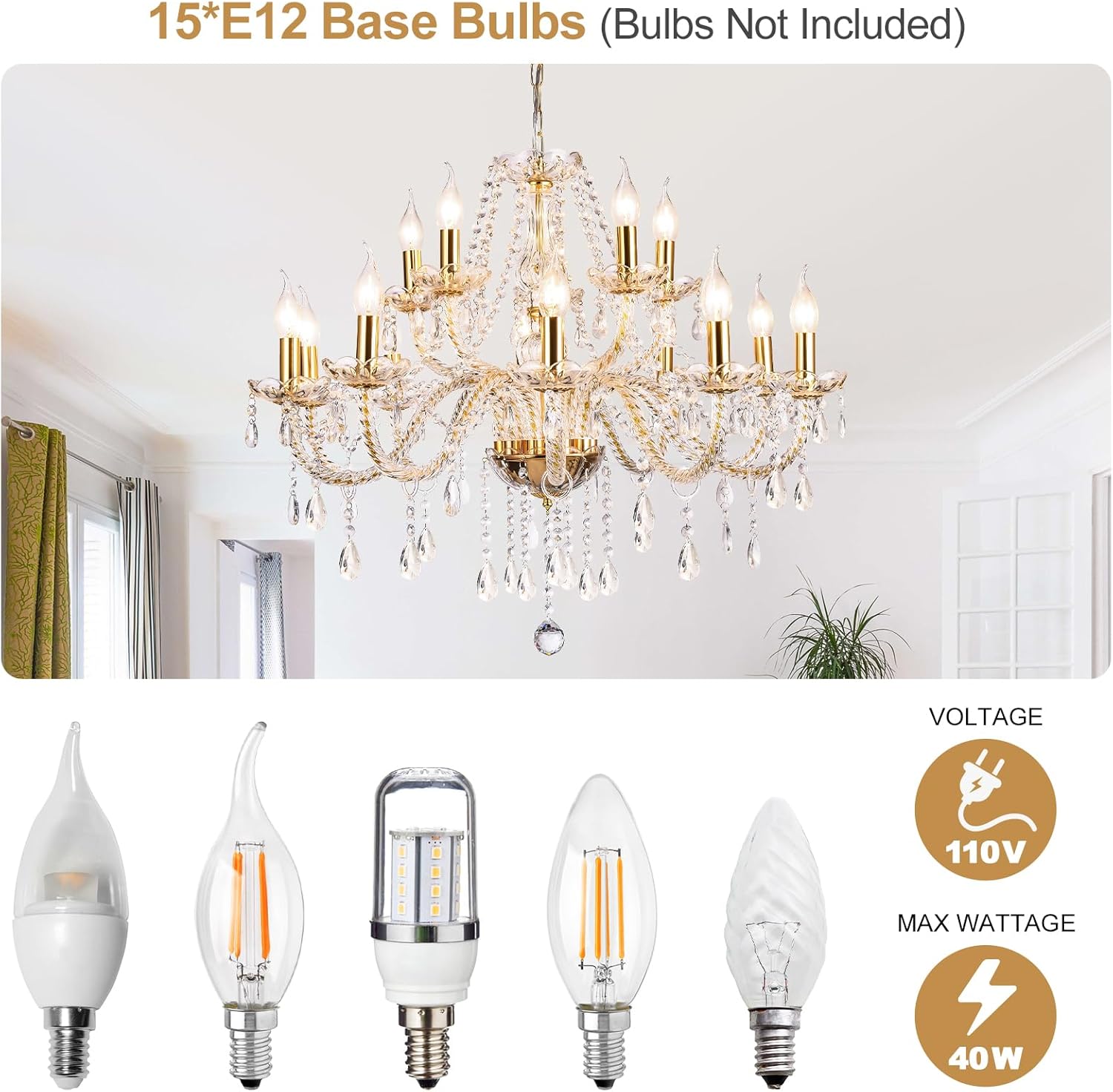 Modern Elegant 15 Lights K9 Crystal Glass Chandelier Golden Pendant Ceiling Lighting European Style for Dining Living Room Bedroom Transparent,15 E12 Bulbs Required