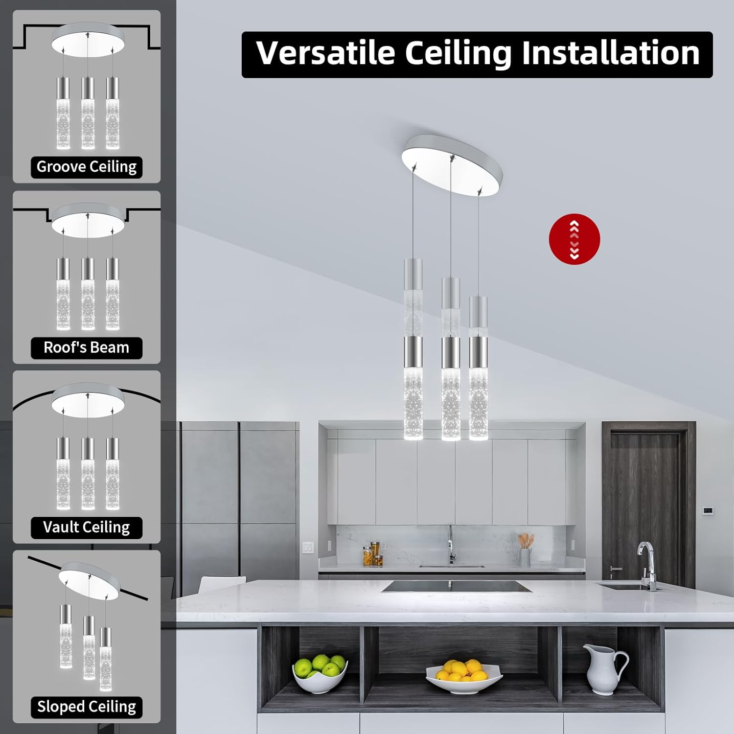 - 【Versatile Modern Design Beyond the Kitchen】 From industrial-chic dining rooms to minimalist bedroom vanities, this adjustable pendant light blends with any decor. Pair multiple units over conference tables or studio workstations. Dimmable pendant light with ETL dimmable driver can achieve 0%-100% brightness adjustment, but needs to be used with smart voice or App control.
