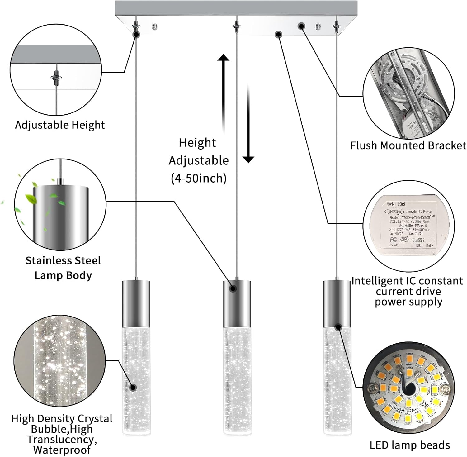 - 【Simplicity Modern Design】 Modern pendant light Electro-Chrome steel sconces and cylindrical crystal bubble lamp posts will add more luxury, noble, and artistic atmosphere to your home, let your island light add a high-end atmosphere to your kitchen.