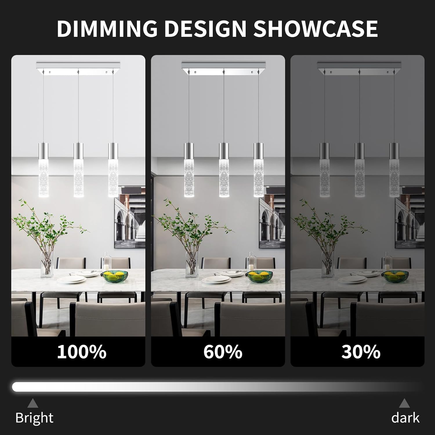 - 【Versatile Modern Design Beyond the Kitchen】 From industrial-chic dining rooms to minimalist bedroom vanities, this adjustable pendant light blends with any decor. Pair multiple units over conference tables or studio workstations. Dimmable pendant light with ETL dimmable driver can achieve 0%-100% brightness adjustment but needs to be used with a dimmer or smart switch.