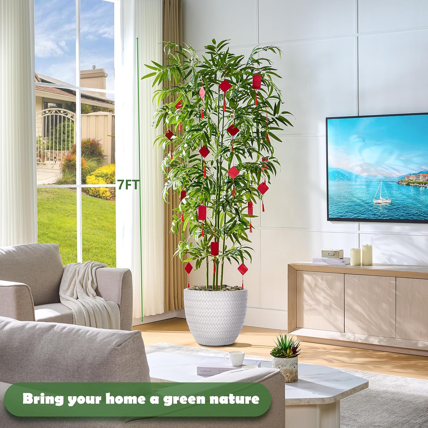 - Ultra-Realistic Indoor Artificial Tree: This 7ft/80in tall artificial bamboo plant has 4 smooth pristine trunks connected with arching bamboo leaves with realistic texture. Inclus a white planter(7"H x 7"W). The interior of the planter is made of sturdy cement and the surface is decorated with non-falling coloured pebbles and the base use anti-tip tilt protection for greater stability