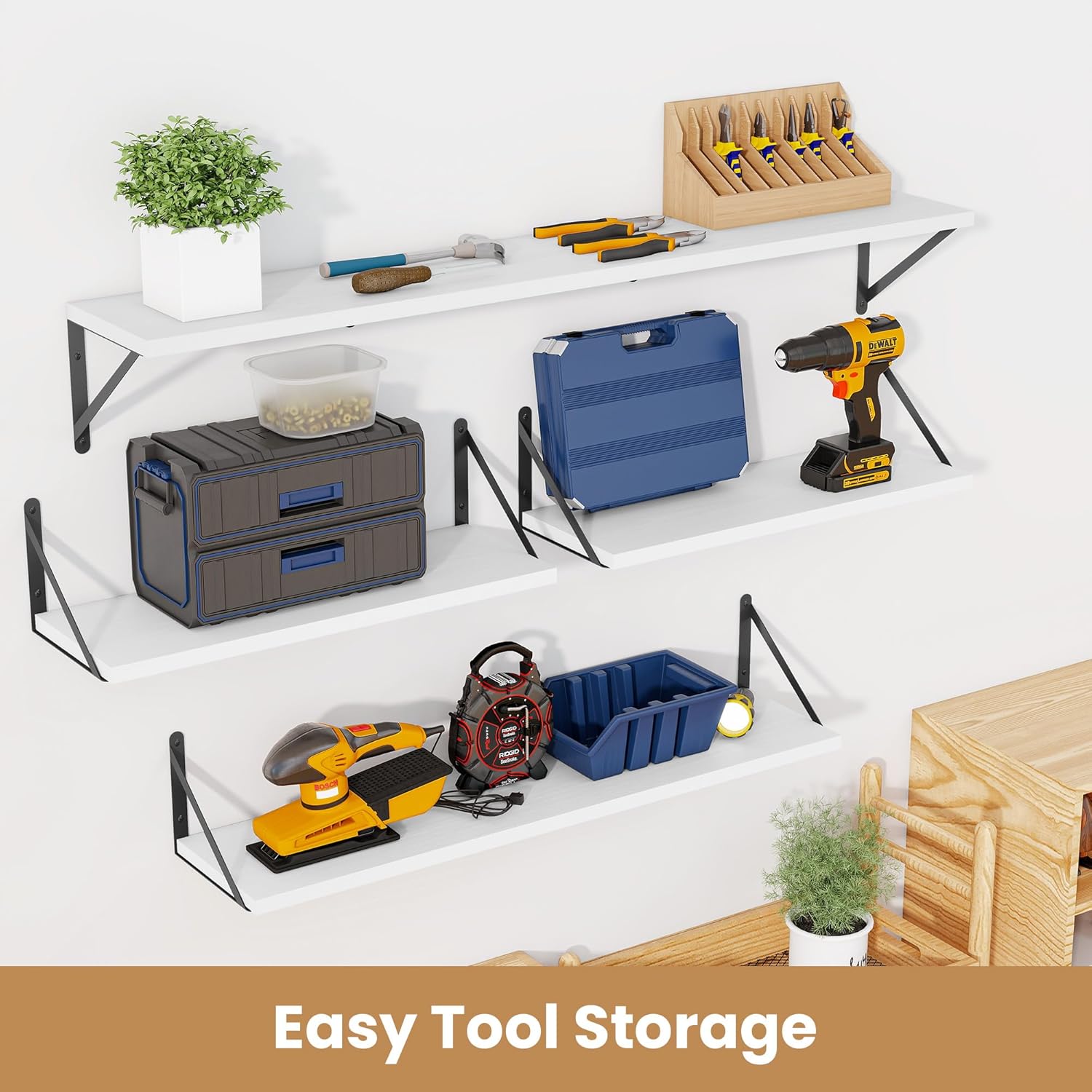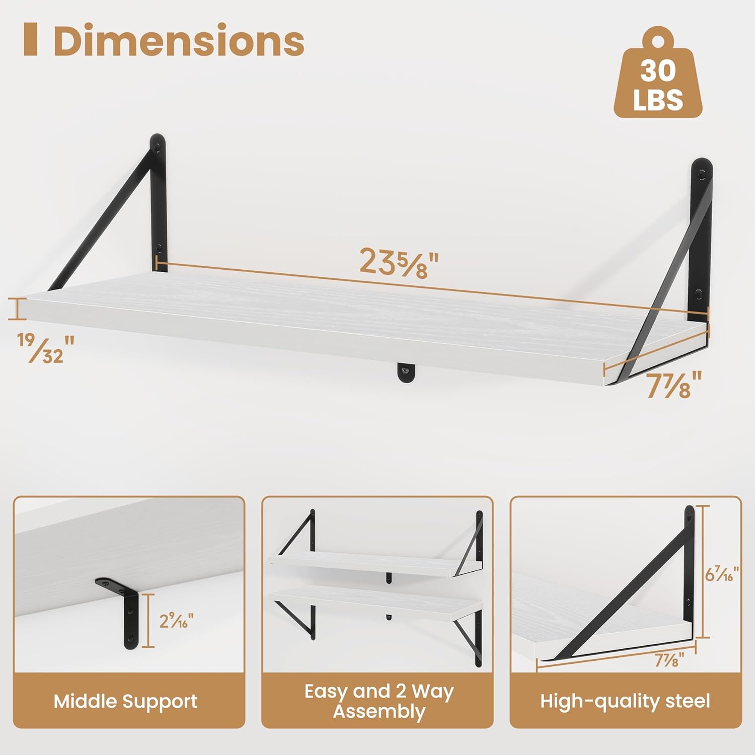 - ăSturdy and DurableăThe wall-mounted shelves are sturdy enough,with a load-bearing metal frame added in the middle,which will not deform and can withstand a weight of 30 pounds. It is very suitable for use as a wide bookshelf,TV stand,for home office,laundry room. Follow the instruction steps,including all necessary hardware,easy to assemble.