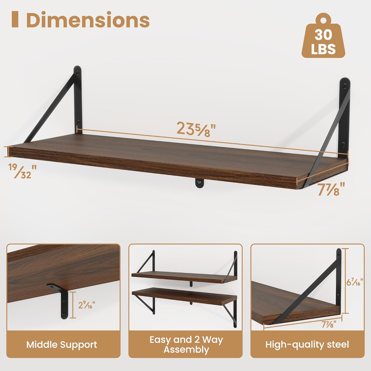 - ăSturdy and DurableăThe wall-mounted shelves are sturdy enough,with a load-bearing metal frame added in the middle,which will not deform and can withstand a weight of 30 pounds. It is very suitable for use as a wide bookshelf,TV stand,for home office,laundry room. Follow the instruction steps,including all necessary hardware,easy to assemble.