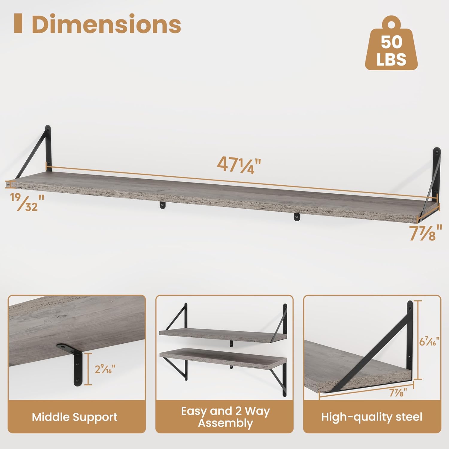- ăSturdy and DurableăThe wall-mounted shelves are sturdy enough,with two load-bearing metal frame added in the middle,which will not deform and can withstand a weight of 50 pounds. It is very suitable for use as a wide bookshelf,TV stand,for home office,laundry room. Follow the instruction steps,including all necessary hardware,easy to assemble.