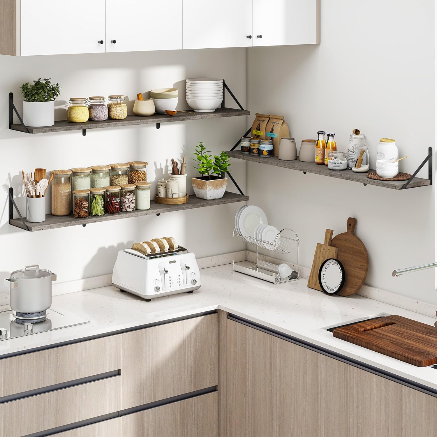 Heimlove 48 Inch Large Floating Bookshelves Set of 3,Wall Mounted Bookshelves,Heavy Duty Bracket Shelves for Living Room,Bedroom,Kitchen,Laundry Room Storage & Decor,Rustic Silver Grey