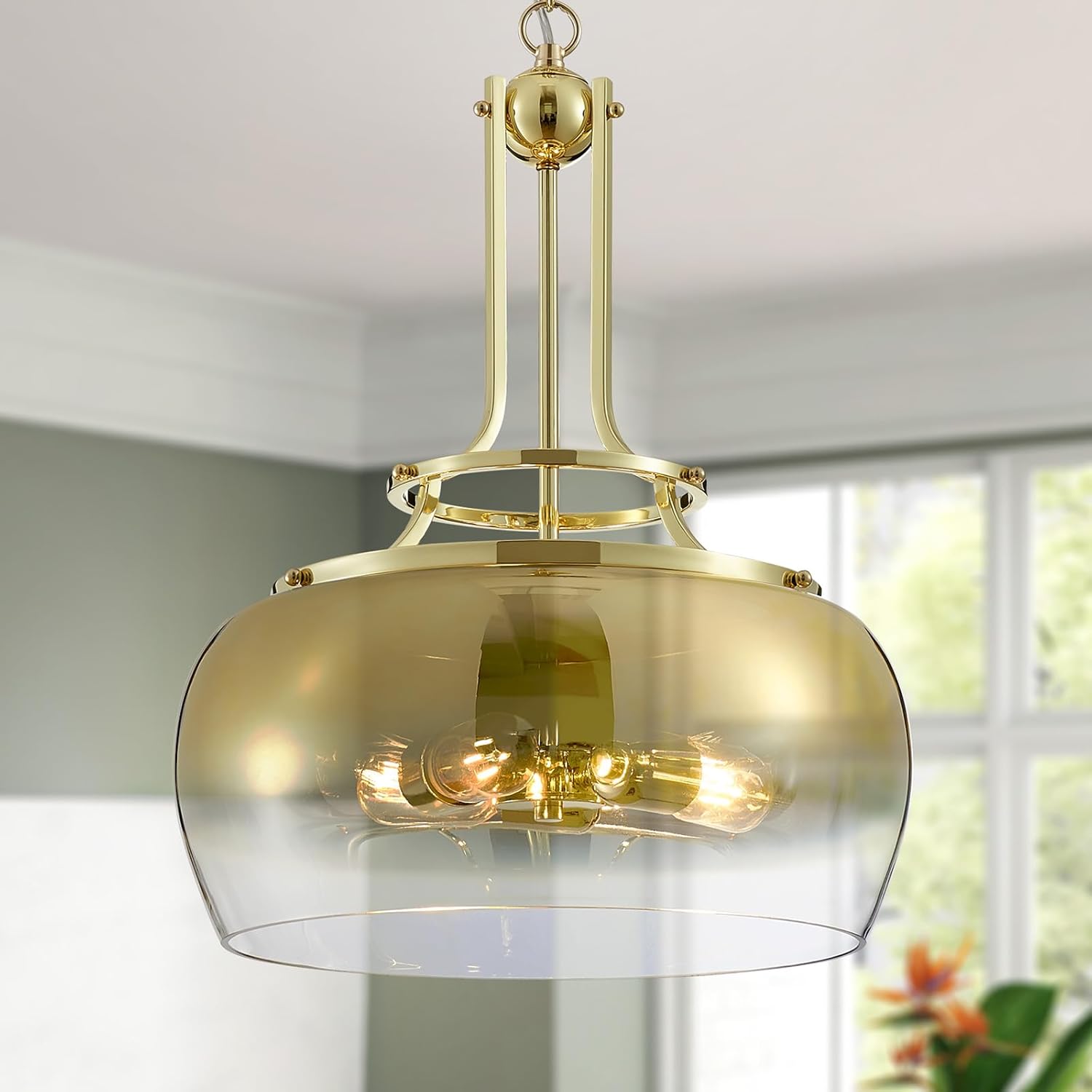 WUZUPS Gold Chandelier Rustic Farmhouse Industrial Round Ceiling Pendant LED Light Fixture with Gradient Glass Shade for Dining Room Kitchen Island Foyer Entryway, H 20.9" W 15.9", E26 Base